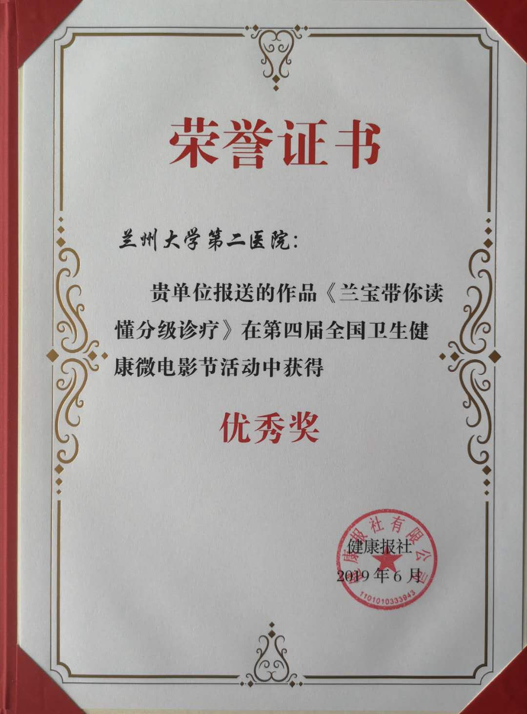 每日甘肃网讯 (新甘肃·每日甘肃网记者 王彬) 6月15日,由健康报社主办的“第四届全国卫生健康微电影节”颁奖活动在成都举行。中国医药卫生文化协会会长陈啸宏、国家卫生健康委员会宣传司副司长米锋等领导和嘉宾出席了颁奖活动。由兰大二院党委宣传部制作的原创科普动漫视频《兰宝带您读懂分级诊疗》荣获本次电影节优秀影片奖。