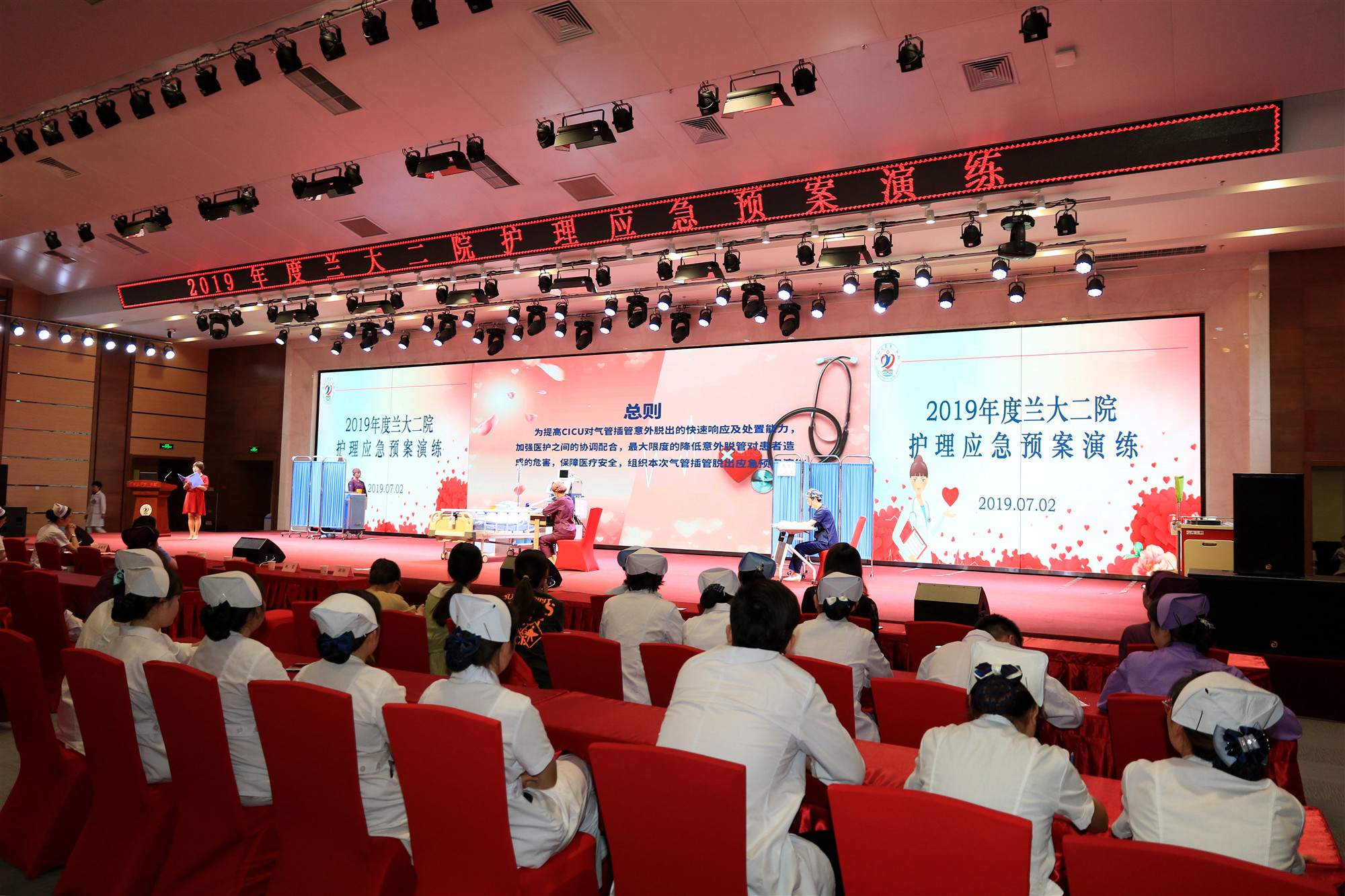 7月2日,我院护理部在萃英大讲堂举办2019年度护理应急预案演练活动。副院长张文芳、护理部主任豆欣蔓、医务处处长何继瑞、保卫处副处长刘一民及全体护士长、护士代表、进修护士、护理实习生500余人参加活动。活动由护士培训科科长张军红主持。