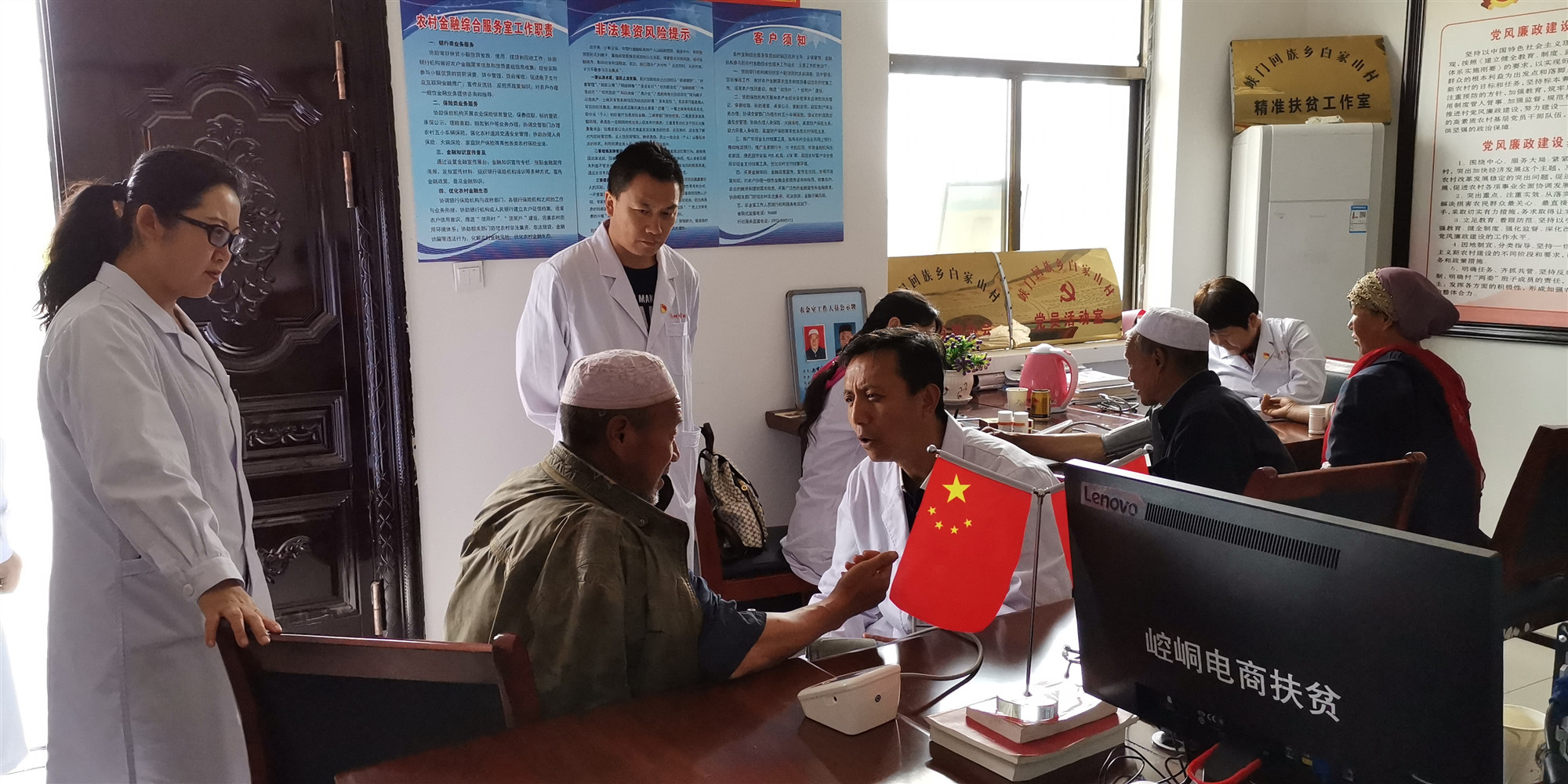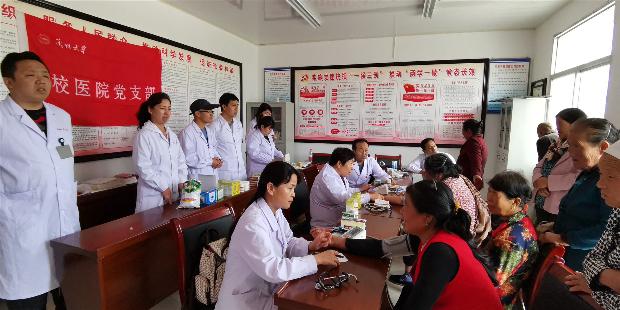 7月9日一大早,校医院党员和入党积极分子乘车前往结对帮扶村平凉汪陈湾村和邻村白家山村开展精准扶贫义诊活动。参加此次义诊活动的医护党员共计16人,涉及内科、外科、中医、护理等临床科室和公共卫生、药学、检验、放射等医技辅助科室。