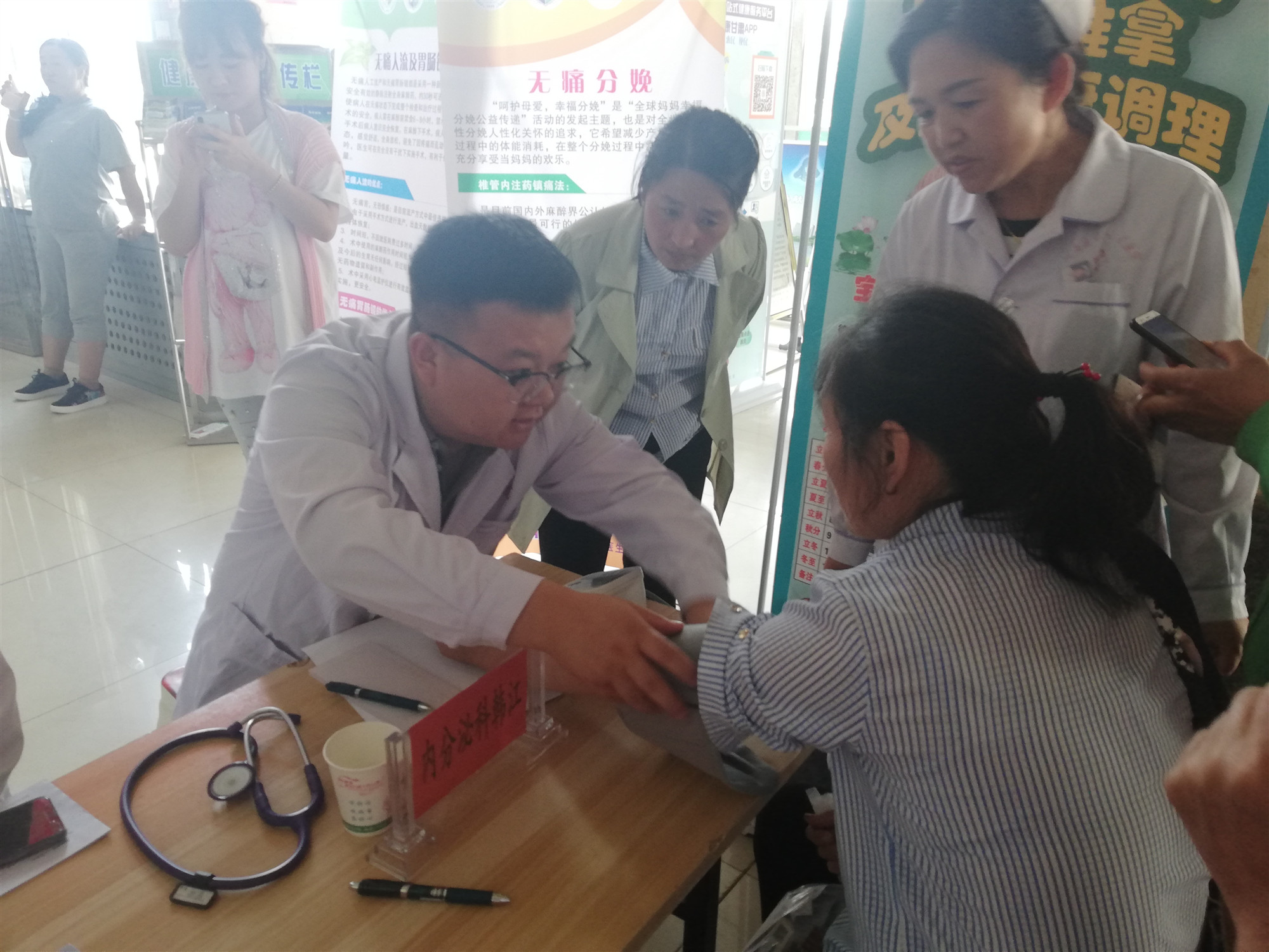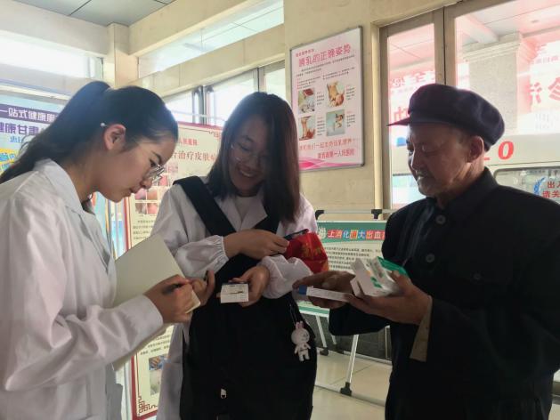暑期社会实践团的队员们积极协助医生展开义诊,进行量血压、测血糖等工作,同时,专家们在疾病诊疗时对协助工作的实践团学生进行专业知识的讲解,使学生们理论学习与实践相结合,进一步融会贯通。随着义诊的进行,大厅里的患者越来越多,需要帮助的人数骤增,暑期社会实践团的学生也尽己所能为他们提供帮助。同时还有一批队员对现场群众进行医疗与健康的科普和”人们对心脏病防治程度的了解”的现场调研。