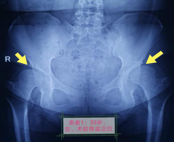 患者一,年龄33岁,女性,双髋疼痛1年左髋加重3月。近期步行超过200米后因髋关节疼痛而不能继续行走,严重影响日常生活工作。患者二,年龄41岁,女性,双髋疼痛3年右髋加重1年,步行超过100米后疼痛不适导致行走功能障碍。入院后完善相关检查,医务人员针对患者伤情的特殊性反复研究、详细计划,在获得家属及患者同意下,实施髋臼周围截骨术。