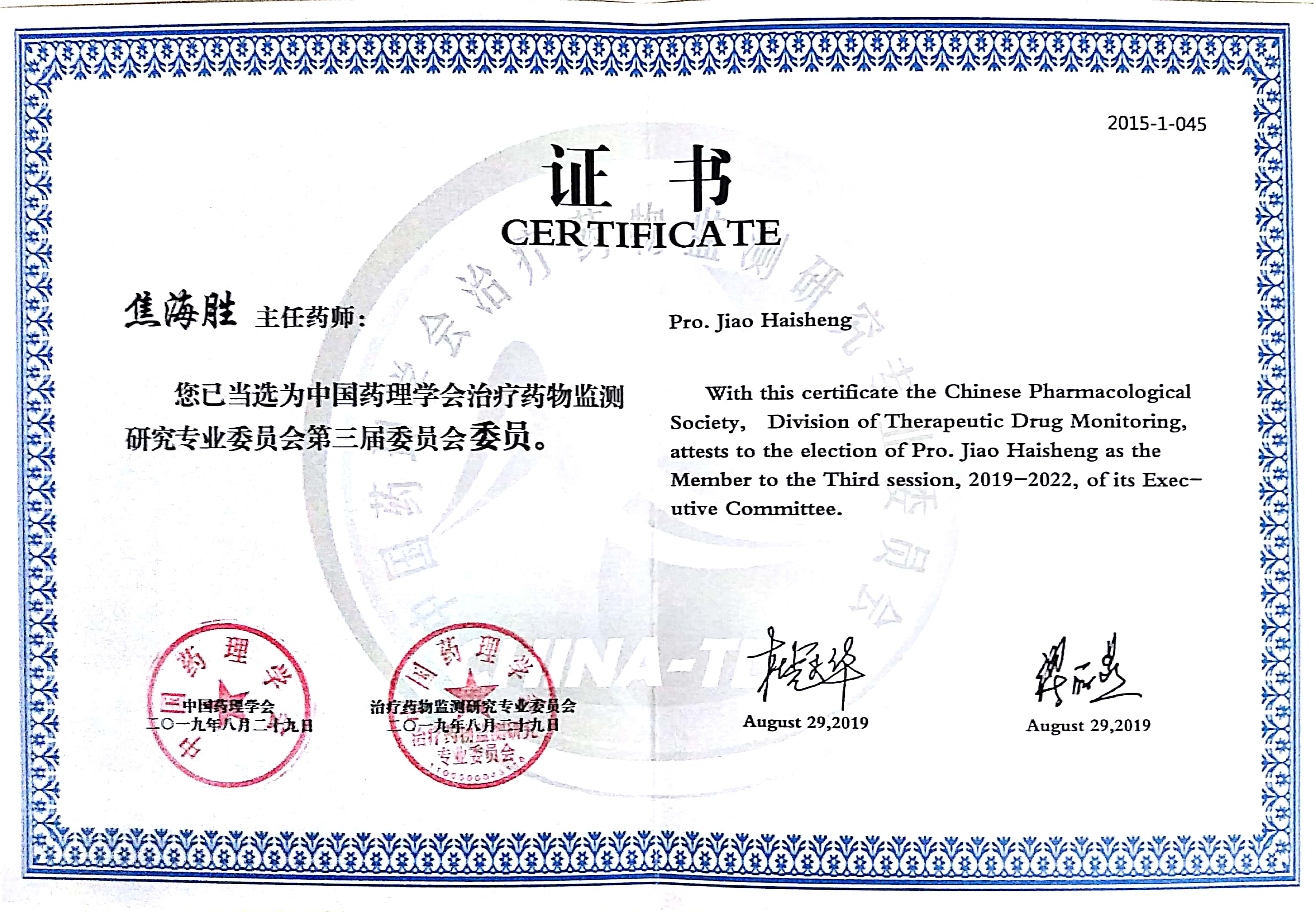 近日,中国药理学会治疗药物监测研究专业委员会换届会议暨第三届专业委员会第一次常务工作会议在苏州召开。会上,我院焦海胜教授当选中国药理学会治疗药物监测研究专业委员会第三届委员会委员。