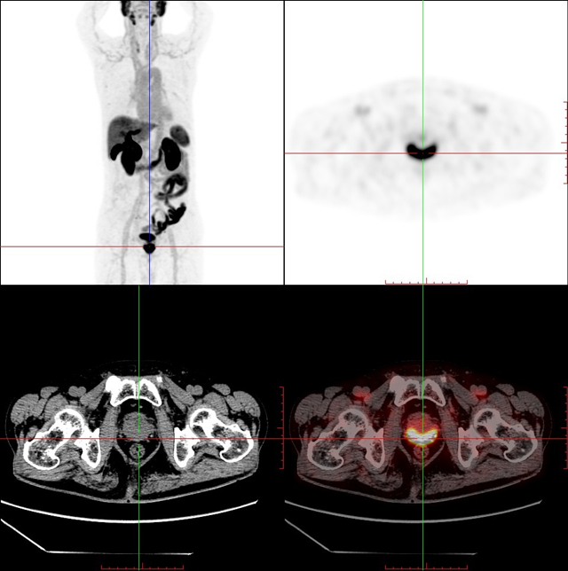PSMA,前列腺特异性膜抗原是一种II型跨膜糖蛋白,在90%以上的前列腺癌细胞中高特异性表达,是前列腺癌诊断特异性靶点。18F-PSMA-1007 PET-CT显像作为一种无创的全身性影像检查,在诊断原发前列腺癌的同时,可对患者进行分期及危险度分层以及复发的监测,实现一站式的影像学评估,为临床医师提供最全面最精准的临床分期,对指导治疗意义重大。