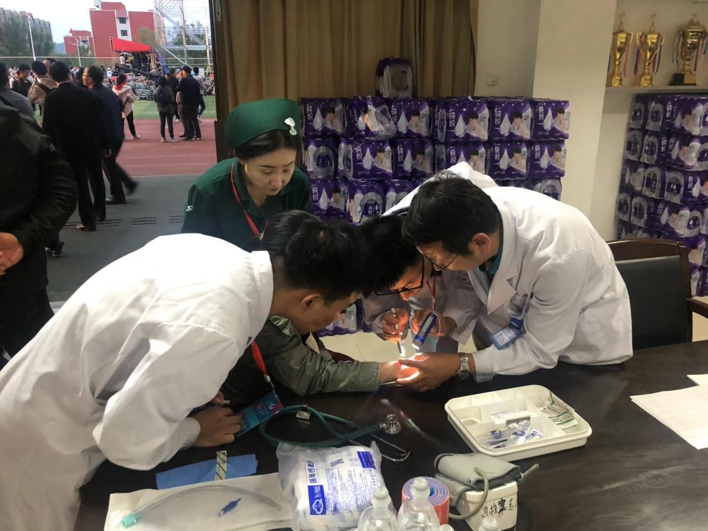 在校庆文艺晚会现场,我院派遣救护车2辆、校医院救护车1辆负责伤病员转运工作,抽调心内科、急救中心、消化内科、骨科等副高职称以上人员及相关专业护理人员共8人进行现场救治工作,组织我院8名规培生作为医疗卫生保障志愿者进行现场协助,高标准、高质量完成了医疗保障各项任务。