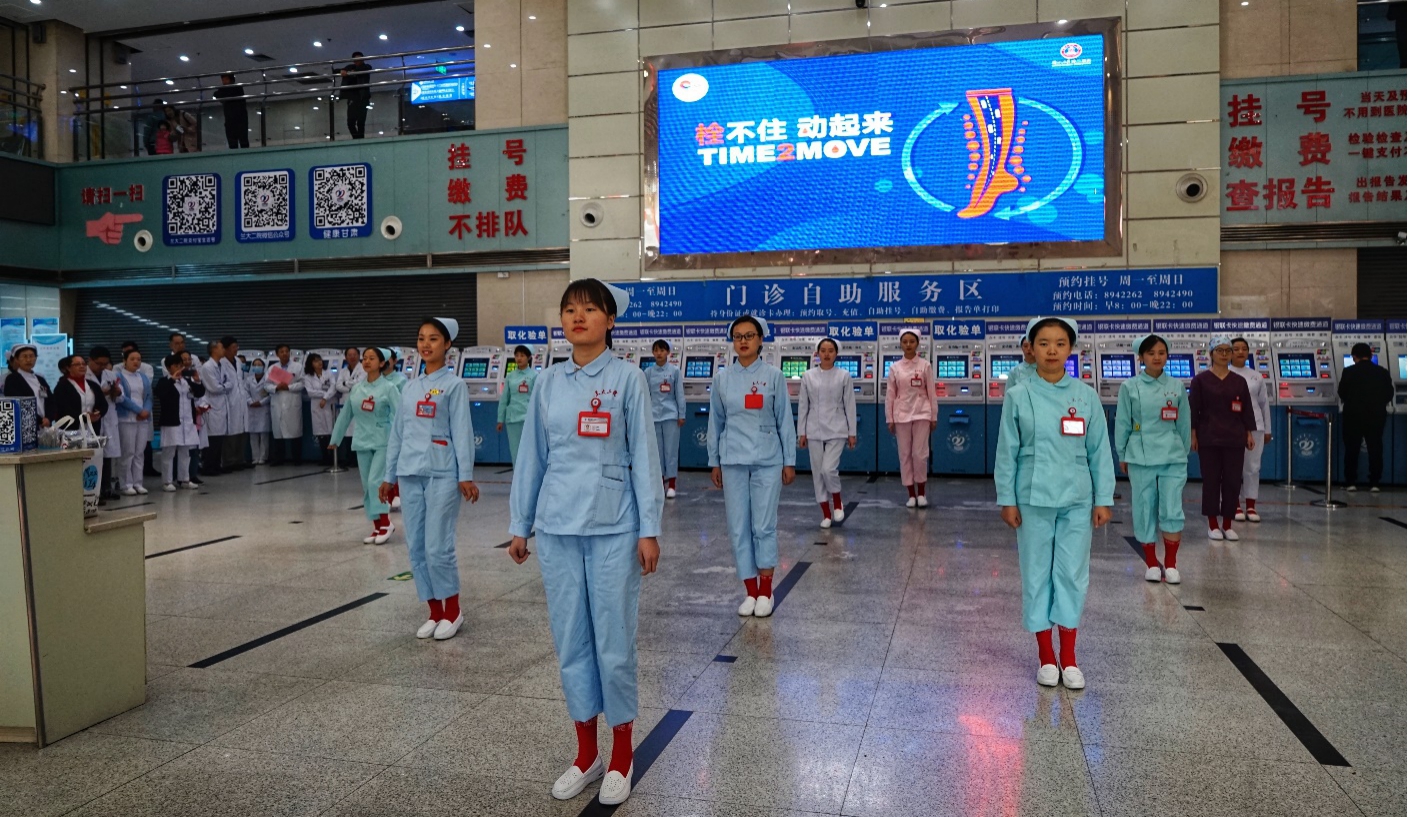 10月12日上午,在兰大二院门诊部一楼大厅,由20名护士组成的“爱心型”方队,穿着统一印有“栓不住、动起来”宣传标语的红色袜子,伴随着悠扬的音乐,向患者展示了如何有效预防血栓的下肢功能锻炼操,拉开了我院第六个“世界血栓日”义诊宣传活动的序幕。