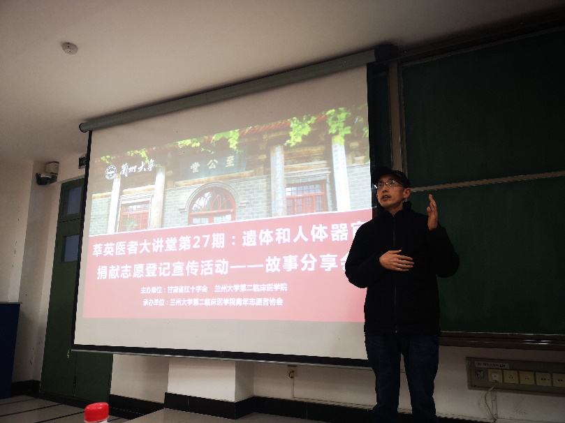 分享会中,大家共同观看了“器官捐献·生命的礼物”视频,对无偿捐献遗体器官有了初步认识,贾伍亮对同学们提出的相关问题也做了耐心解答。随后,李英讲述了作为生命延续“使者”的感人故事,李子恒讲述了患病治疗的亲身经历,张森为同学们分享了个人踏上志愿服务之路的历程。张森的讲解用情至深,在场的同学无一不动容,他通过自己的亲身经历,讲述了器官捐献的重要性,整个过程中没有豪言壮语,没有惊天动地,但却催人泪下,在他的成长历程中写满了博爱、奉献的字眼,张森十九年如一日坚持开展公益活动,参加无偿献血,帮助孤寡老人、残障青少年,成立中国西部首个大学生干细胞库,坚持不懈的做力所能及的事情,去帮助需要帮助的人,传递着温暖与关爱,他用自己平实的语言、不懈的坚持感动了在场的每一个人。之后,张森针对捐赠的程序、相关政策和相关知识进行了详细的介绍,他还建议同学们可以登录中国人体器官捐献管理中心、甘肃省红十字会等官方网页平台了解相关的理论知识。在分享会接近尾声时,第二临床医学院青年志愿者协会的学生骨干向同学们发放了调查问卷。整场讲述,让同学们体会到了器官捐献对我国当前医疗现状的重要性与必要性,明白了作为一名医学志愿者身上的光荣使命和责任。
