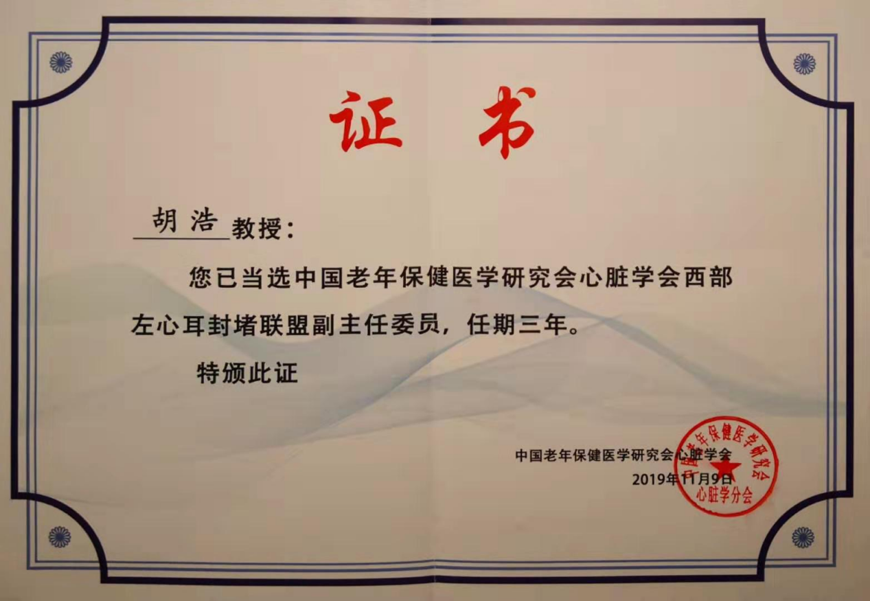 兰大二院心血管内科胡浩当选中国老年保健医学研究会心脏学会西部左心耳封堵联盟副主任委员