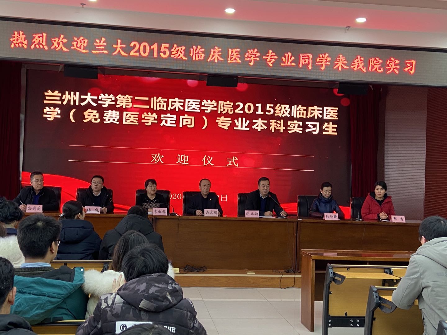 1月2日,在第二临床医学院副院长阎立新带队下,第二临床医学院2015级临床医学专业(免费订单定向)学生共计94人赴定西市人民医院开展为期20周的基层医院实习。定西市人民医院召开欢迎大会,医院党委书记马启明、副院长李淑梅以及科教部全体工作人员参加会议。