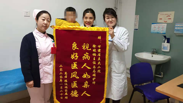1月20日下午,一名女士带着孩子来到我院儿科门急诊,将一面绣着“视病人如亲人、良好医德医风”的锦旗送到小儿消化科副主任徐晓楠和儿科护士马娟手中,向她们以及儿科全体医护人员表达最真挚的感谢。