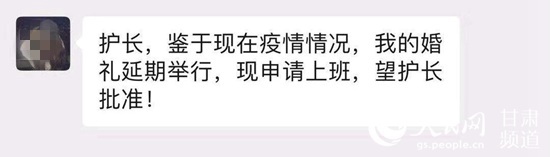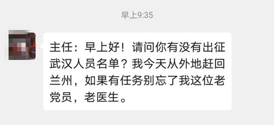 人民网兰州1月29日电(王文嘉)“我今天从外地赶回兰州,如果有任务别忘了我这位老党员,老医生。”“护(士)长,我的婚礼延期举行,现申请上班!”正值新春佳节之时,面对新型冠状病毒感染的肺炎疫情,兰大二院医护人员立即投身到防控一线,其中,很多医护人员主动请缨赴武汉参与疫情防控工作。