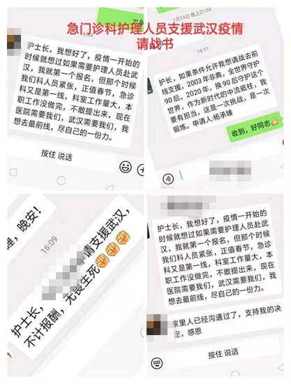 “国家有难、匹夫有责!更何况我们不是匹夫!”在第一批援鄂抗疫医疗队出征后,一封封“请战书”更如同雪花一样,飘然而至。大多数人甚至顾不上写“请战书”,在微信里和科室负责人争取名额奔赴武汉。
