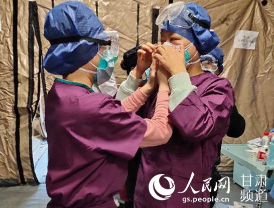 医护人员进入方舱医院前进行准备工作。(兰大二院供图)