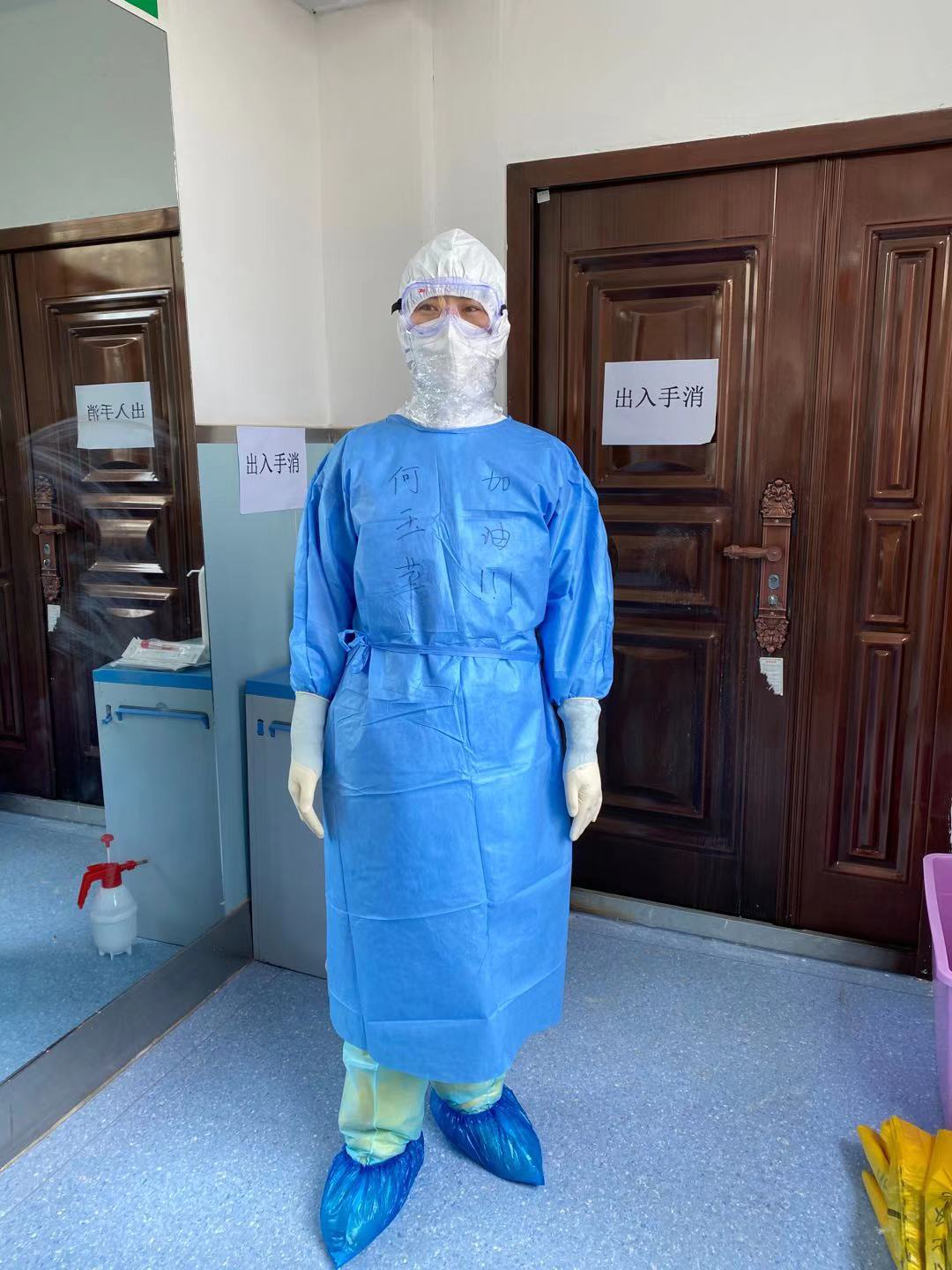 王虹主任在工作上对我们的要求非常严格,每天都会督促大家交班,讨论病例,带领我们学习关于新型冠状病毒的诊疗方案和一些护理要点。同时她已是两个孩子的母亲,由于工作繁忙没有时间陪伴孩子,有的时候我看见她和孩子视频完偷偷的抹眼泪。对于我们,她同样把我们看作孩子般对待。我和搭档作为第一披进入发热病房的护士从病房里出来时,脸上早已被护目镜压破了,主任看见我们,哽咽着对我们说:“孩子们,辛苦了,赶快过来吃饭吧!”然后又偷偷擦干眼泪,转身笑着对我们说:“今天工作怎么样呀?能适应不?.......”。永远都忘不了她那一刻的神情。为了让我们更好的投入到工作中去,王虹主任总是把自己最坚强的一面留给我们,时不时的给我们开开玩笑,让我们可以放松放松,但有时看见她疲惫的身影,真的特别想抱抱她。主任,您辛苦了!
