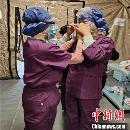 立博欧赔指数第二医院援助武汉护理专业医疗队成员互相整理穿戴防护服。(资料图) 兰大二院供图