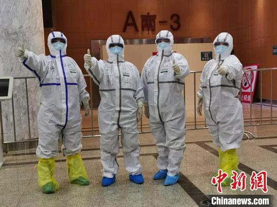 甘肃省人民医院援汉护理专业团队队员进入病区工作前加油打气。(资料图) 甘肃省人民医院供图