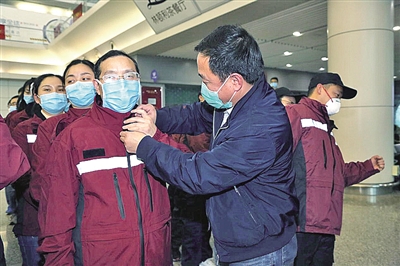 重庆医科大学附属第二医院附属领导在机场大厅为出征队员们整理服装。资料照片