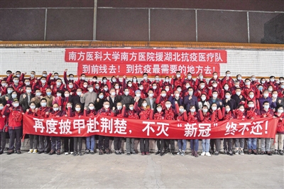 2月10日,广东首批支援湖北荆州应对新冠肺炎医疗队的81名南方医科大学南方医院医护人员和医院、科室同事在出征仪式上宣誓。