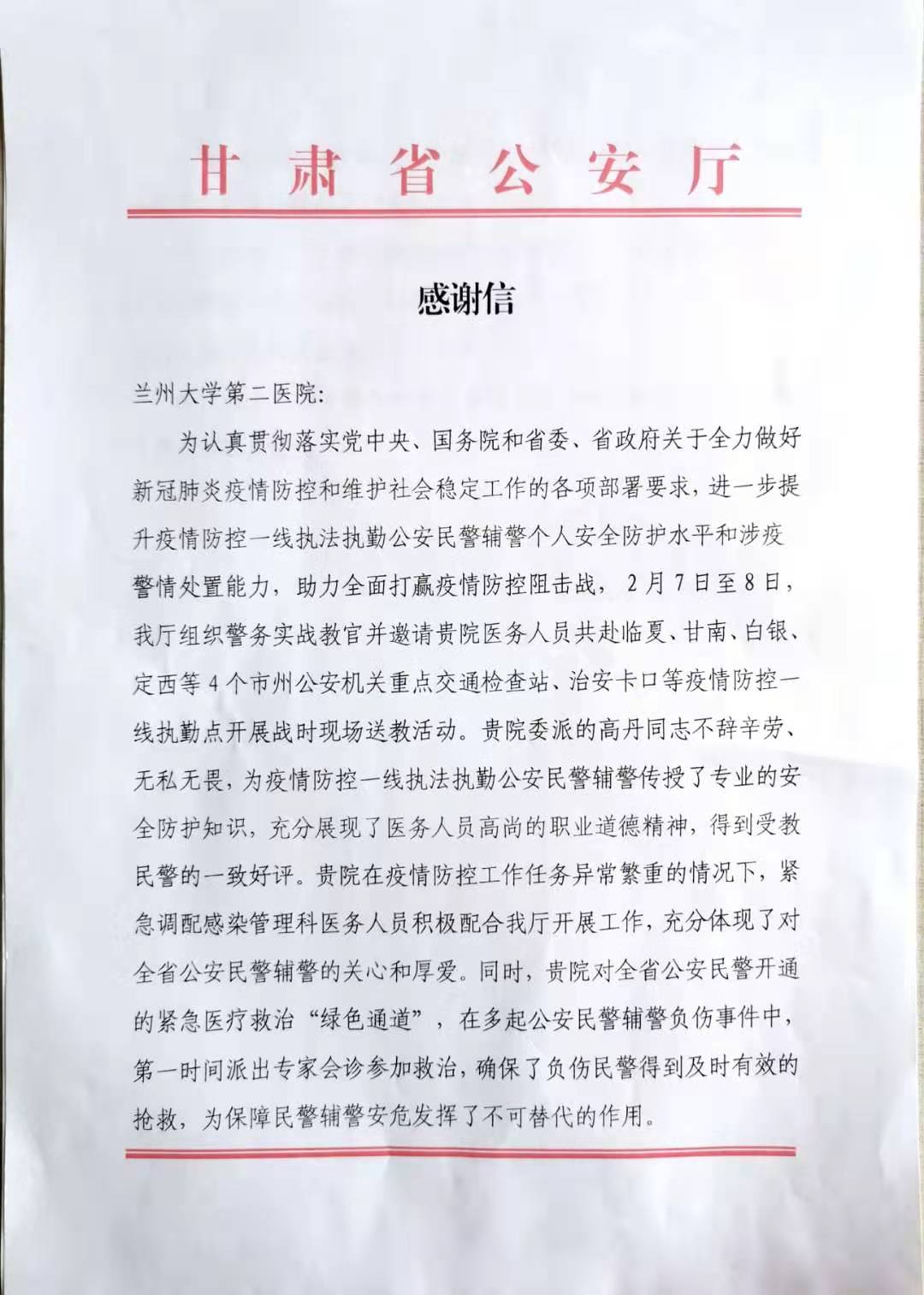 感谢信指出,为认真贯彻落实党中央、国务院和省委、省政府关于全力做好新冠肺炎疫情防控和维护社会稳定工作的各项部署要求,进一步提升疫情防控一线执法执勤公安民警辅警个人安全防护水平和涉疫警情处置能力,助力全面打赢疫情防控阻击战,2月7日至8日甘肃省公安厅组织警务实战教官并邀请我院医务人员共赴临夏、甘南、白银定西等4个市州公安机关重点交通检查站、治安卡口等疫情防控线执勤点开展战时现场送教活动。活动中,我院委派的高丹同志不辞辛劳无私无畏,为疫情防控一线执法执勤公安民警辅警传授了专业的安全防护知识,充分展现了医务人员高尚的职业道德精神,得到受教民警的一致好评。