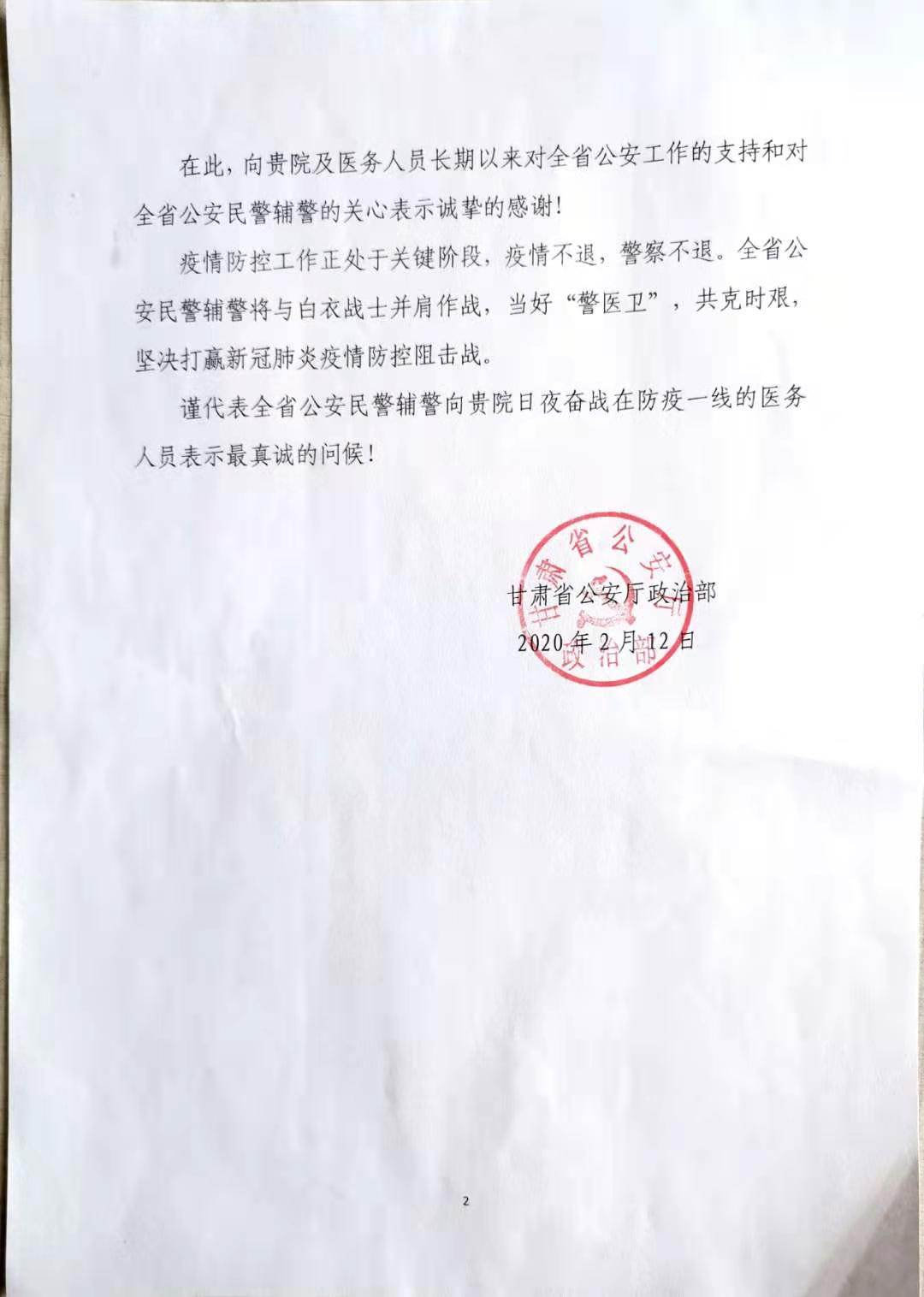 甘肃省公安厅政治部向我院致感谢信
