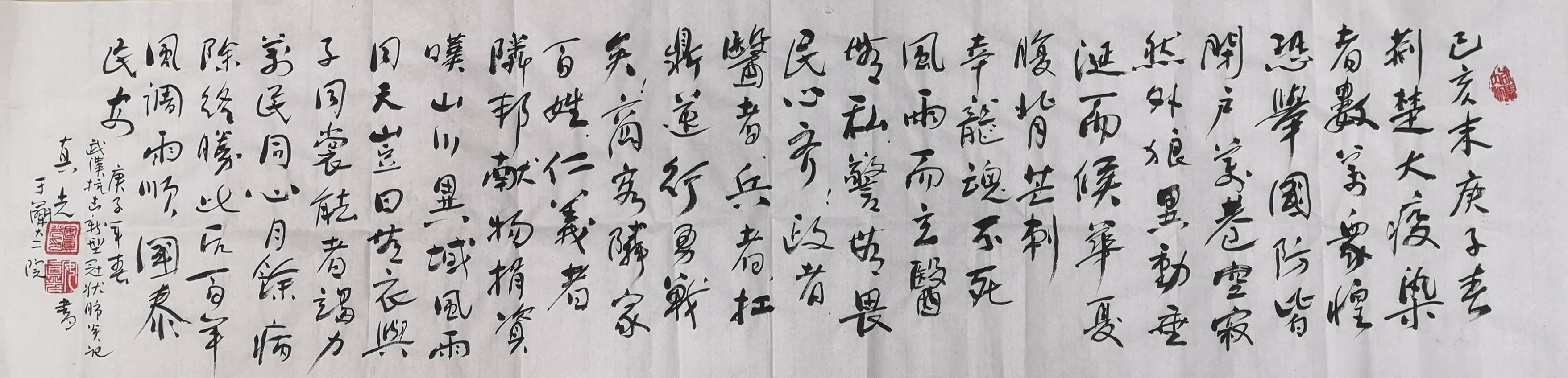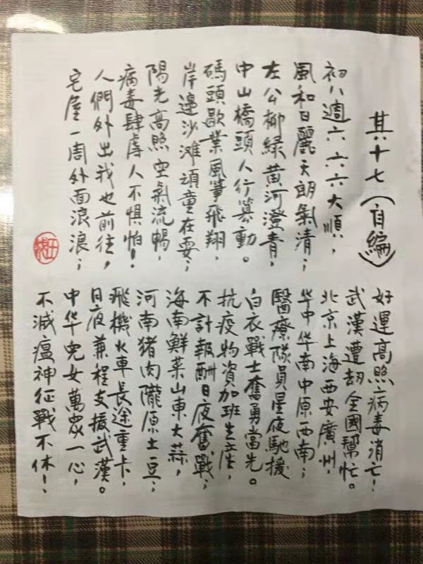 疫情期间,我院离退休老同志们饱蘸激情创作,纷纷挥毫墨书,以书法、绘画、诗词等方式,为人间的大爱讴歌,向奋战在抗疫一线的逆行者致敬,赞抗疫英雄,赞逆行者无怨无悔的英雄情怀,凝聚起抗击疫情的强大精神力量,为坚决打赢防控阻击战贡献余热。