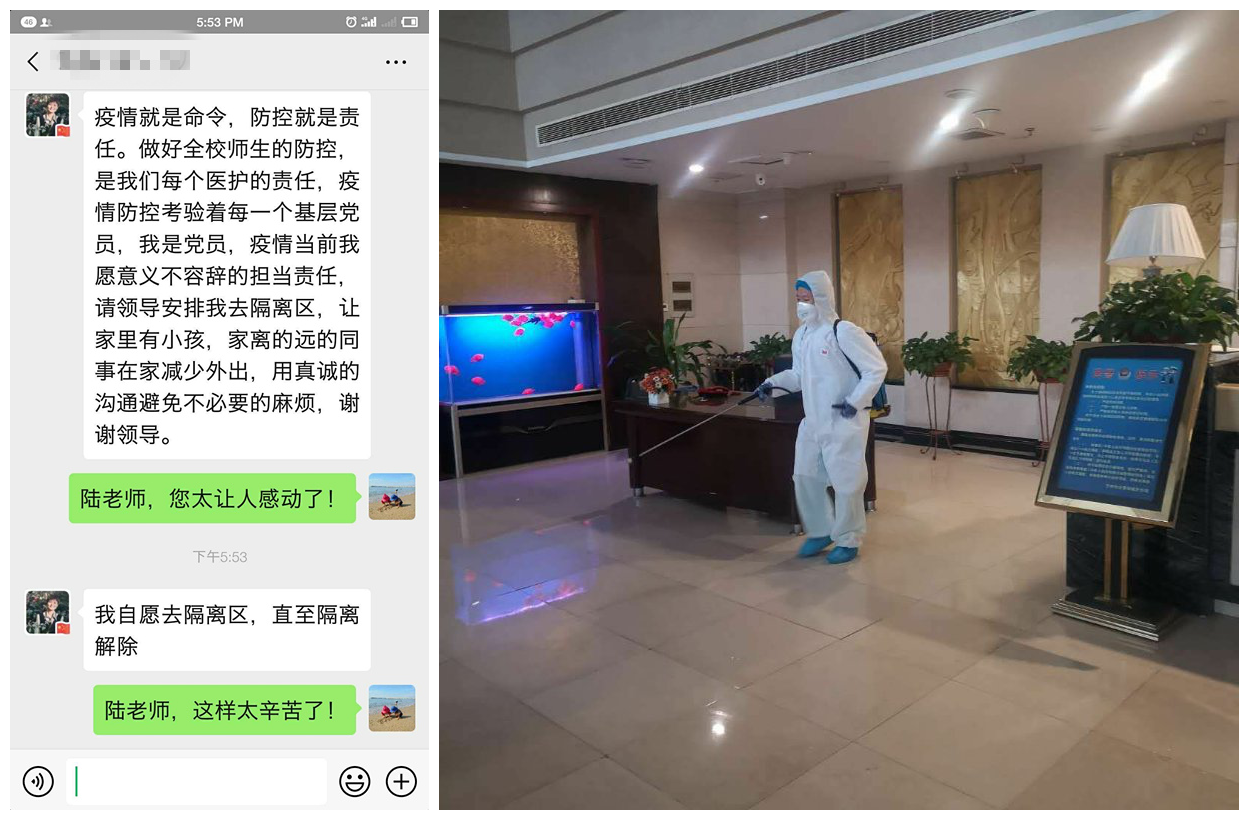当得知学校医学观察场所需要护士驻守时,校医院护士陆立伟主动请战,希望为抗击疫情贡献自己的力量。她说:“我是党员,疫情当前我愿意义不容辞担当责任。”这简短朴实的话语,无不令人动容。截止目前,她已经在医学观察点坚守20天。