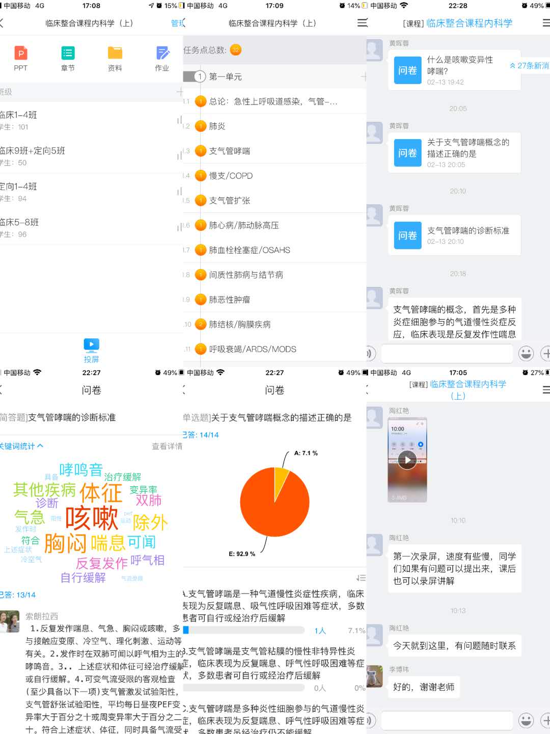本学期学院共开设理论课41门(71门次)、实验课22门(111门次),通过慕课、学习通APP等平台,2020年春季学期所有理论课已按照原定教学计划开展在线教学工作,同时积极利用网络教学平台,创新教学模式,丰富教学内容,并在部分课程中引入疫情防控相关知识,引导学生树立正确的认识、有效防范。不同于传统教学方式,各教研室、承担教学任务的教师为保障教学质量,更加用心备课、精心准备案例、花心思设计课程、细心观察学生的讨论、费心批阅随堂测验。我们的老师摇身一变,成为镜头前的“主播”,采用直播、录播、录屏的方式授课。线上教学不仅提高了对教师授课的要求,更加提高了学生们主动参与学习的动力,整场气氛空前活跃。目前床旁教学及实际操作的见习课程暂未开课,《临床机能实验学》课程将分次上传操作视屏,供学生预先学习。