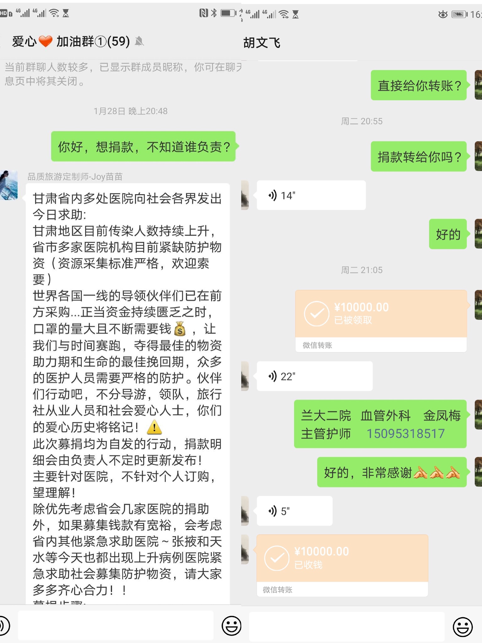 疫情爆发初期,全国各大医院医疗防护用品告急,对于在一线工作的战友来说,没有防护用品就像战场上的战士没有盾和矛一样,赤手空拳自身都难保的情况下,怎能赢得这场战役?内心牵挂着这些,血管外科护士金凤梅,拿出自己的积蓄,在1月28日那天,通过甘肃爱心导游群捐赠从国外购置了一批防护物资,这批物资已于1月30日抵达兰州,随后经过分配送至兰州市各大医院,其中也包括我院。金凤梅本想默默奉献爱心,就没有和任何提起过,后被大家无意间知道,但她依旧表示面对疫情越来越严重,她只是想为大家做点什么。金凤梅捐出的是冷冰冰的纸币,但饱含着的是她对一线战友的关心和对战胜病魔的希望。