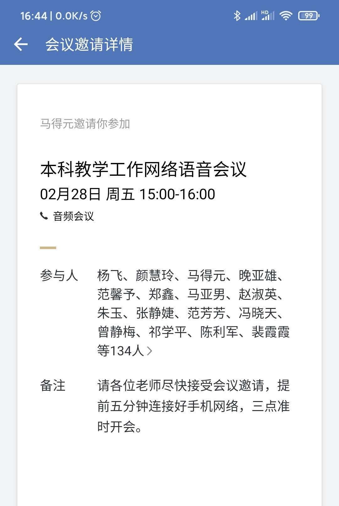 2月28日,第二临床医学院利用企业微信平台,召开2020年春季学期本科教学工作网络语音会议,兰大二院党委副书记、第二临床医学院执行院长张连生,第二临床医医学院学生党总支书记畅兆锋出席会议。各教研室主任、教学秘书,第二临床医学院全体工作人员等110余人参加会议。会议由第二临床医学院副院长阎立新主持。