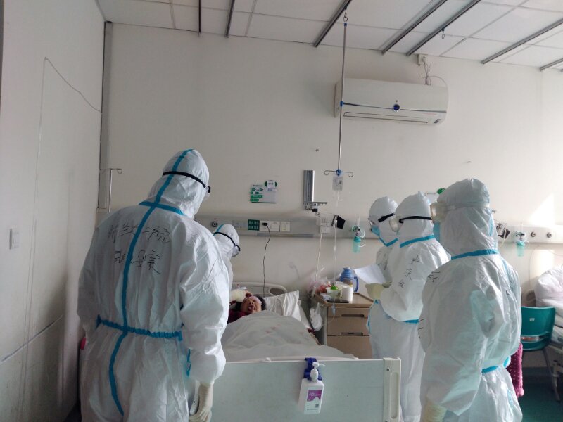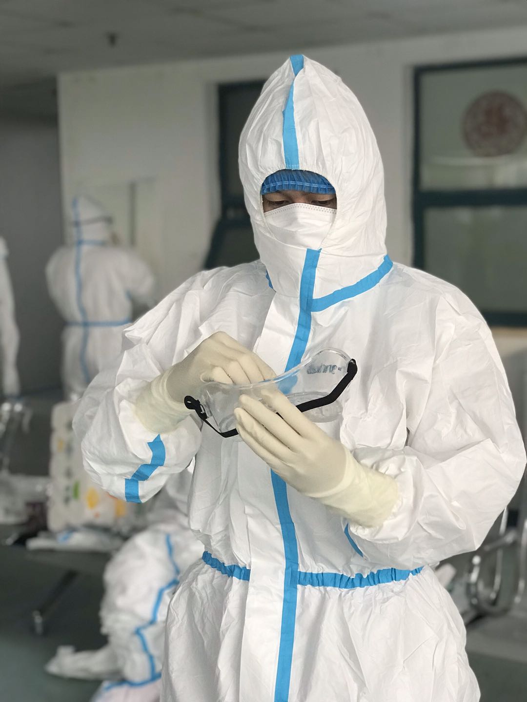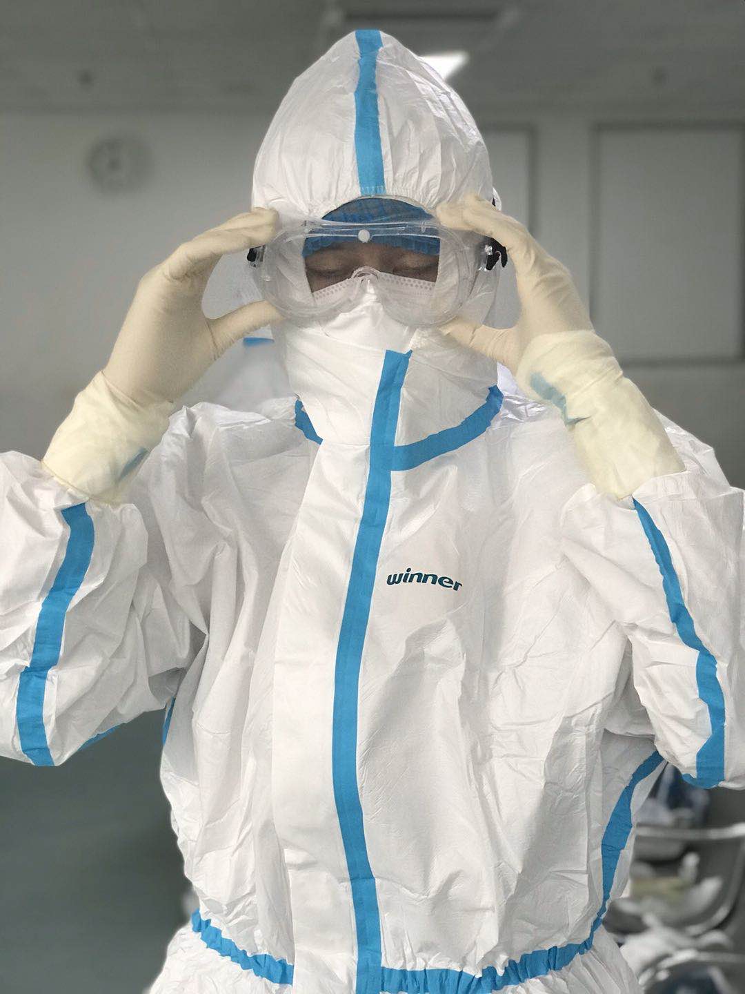 2月25日,我们医疗队正式接管武汉市中心医院后湖院区的呼吸一病区和呼吸四病区,第一天上班时,大家早晨6点就起床了,洗漱、吃早饭、准备用物,在两两相互监督、互相帮助下,我们按照培训时的内容:“一次性帽子—N95口罩—一次性帽子—外科口罩—隔离衣—鞋套—手套—防护服—手套—靴套—护目镜”,坚持穿戴无误后,用黑笔在防护服上郑重的写上我们的姓名。