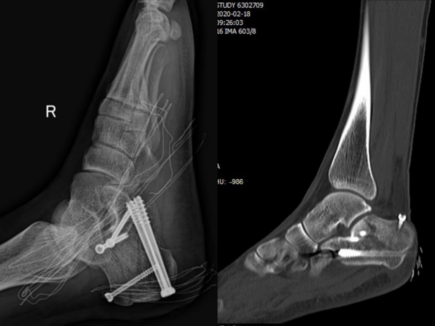 患者,男,27岁,跟骨粉碎性骨折,入院时右足明显肿痛,这种情况下,传统手术需要顾及患者皮肤条件及软组织情况,待患者肿胀消退后才能行手术治疗,一般病程需两周左右,且手术效果差,对周围关节影响较大。通过人工智能机器人导航技术手术,实现了精准医疗及术后早期康复的目的,既缩短了住院时间也减轻了患者经济负担,手术效果理想。