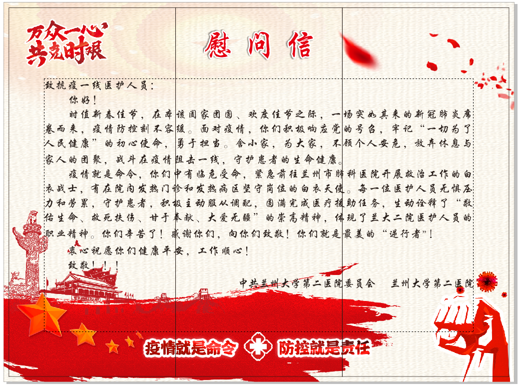 近期,兰大二院领导班子成员对我院抗击疫情防控一线的医务人员及家属进行走访慰问,为他们送上真挚的关爱和问候。