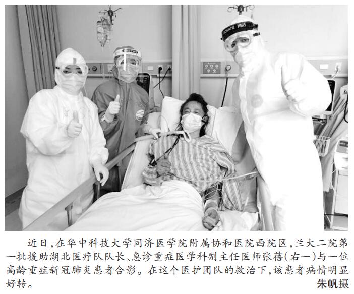 近日,在华中科技大学同济医学院附属协和医院西院区,兰大二院第一批援助湖北医疗队队长、急诊重症医学科副主任医师张蓓(右一)与一位高龄重症新冠肺炎患者合影。在这个医护团队的救治下,该患者病情明显好转。