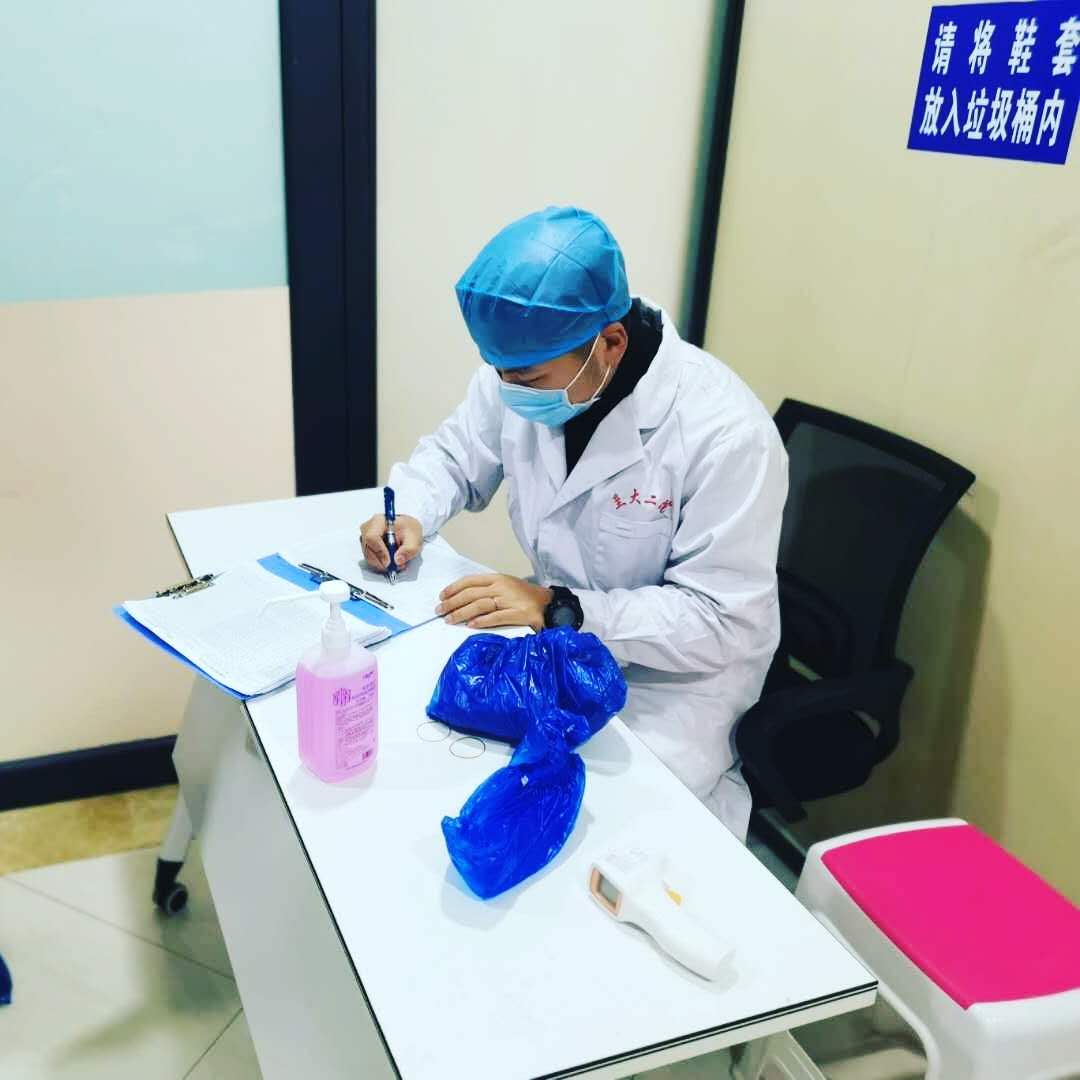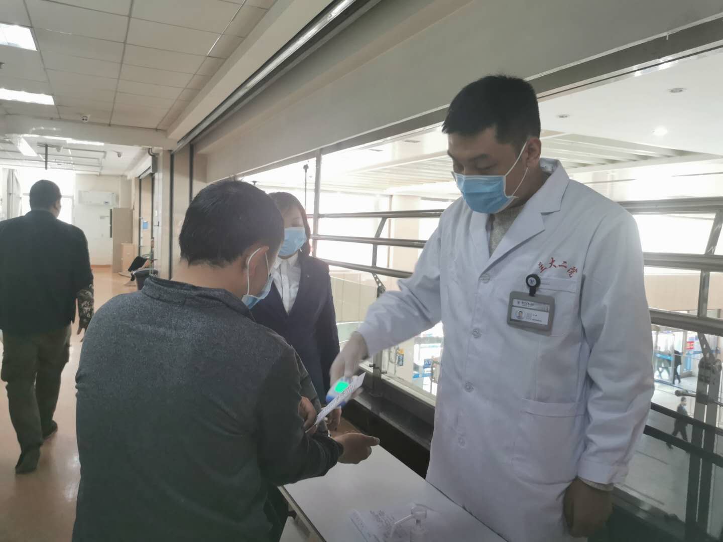 和刘欣同样参与在预检分诊志愿工作中的,还有审计处肖弘亮,他们有着共同的目标:全力抗击“新冠”疫情,为一线医护人员分担压力!“我的第一班岗是在急诊留观区,自己也曾恐惧过、紧张过,但只要换上白大褂,拿起测温枪的一刻,我就是抗疫战线上的‘侦察兵’,强大的使命感会忘却一切。在住院部②职工电梯间值班时,医护人员主动配合出示工牌并和我们互道一声‘谢谢’时,又觉得自己充满了干劲。在工作的过程中,努力做到不落下任何一个可疑信息,不漏掉任何一个排查对象。重复的话每天要说上千遍万遍,一轮轮周而复始,虽然苦、虽然累,但在这个特殊的岗位上,我体会到了太多人间真情,家人朋友的挂念、领导同事的关心、小组成员的互助互爱,这些都无不让我感动,是你们温暖了这个春天,也感动了我。作为一名党员,一名二院人,定将不辱使命,尽职尽责,坚守岗位。”说起自己的志愿者工作,肖弘亮眼中散发着信念的光芒。