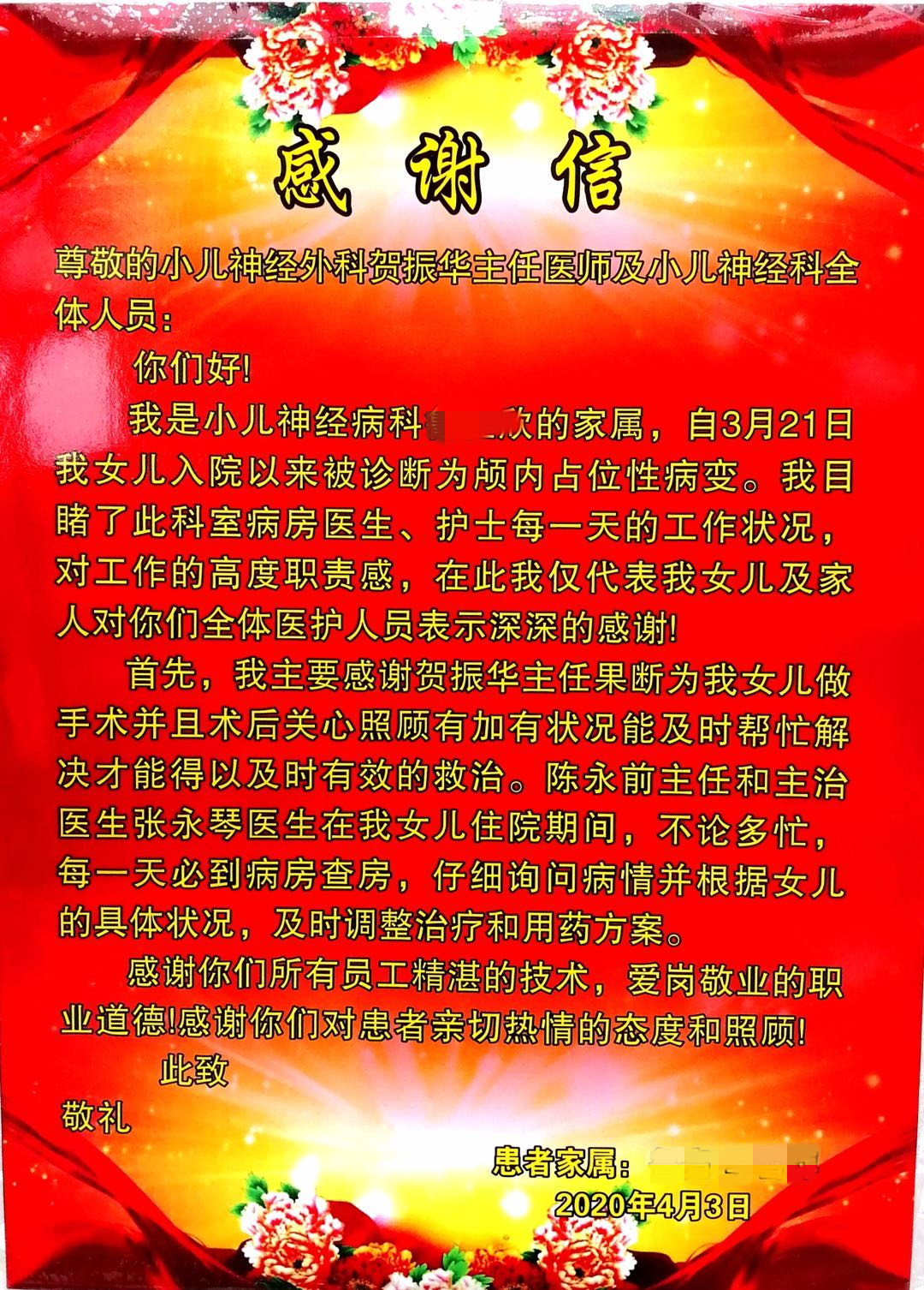 术后,儿童医院为患儿制定了的周密的治疗方案,经过抗炎、止血等一系列对症治疗后,欣欣病情慢慢好转,已经能下床走路了,看着女儿的小脸慢慢露出了天真可爱的笑容,欣欣爸爸心里别提有多高兴了!他感慨生命,感恩所有帮助他的医生护士,为表示感谢,他特意送来锦旗。