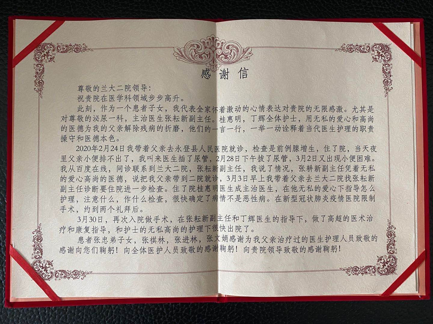 一纸感谢信,一份医患情——兰大二院医护人员柔心济世心系患者