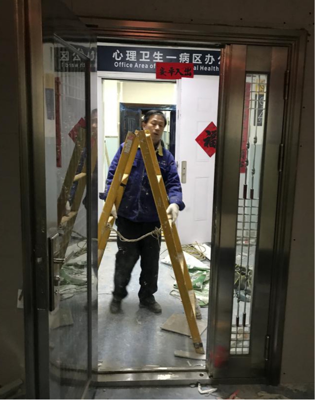 紧急维修改造:1月26日大年初二接到医院的任务,把住院部五号心理卫生科一病区二病区、皮肤科、神经内三科临时改造成为发热患者隔离病区,立即组织施工人员当天开工,克服改造难度大,建筑材料严重匮乏的现状,有条不紊、分工合作、日夜奋战,于1月29日完成改造任务。