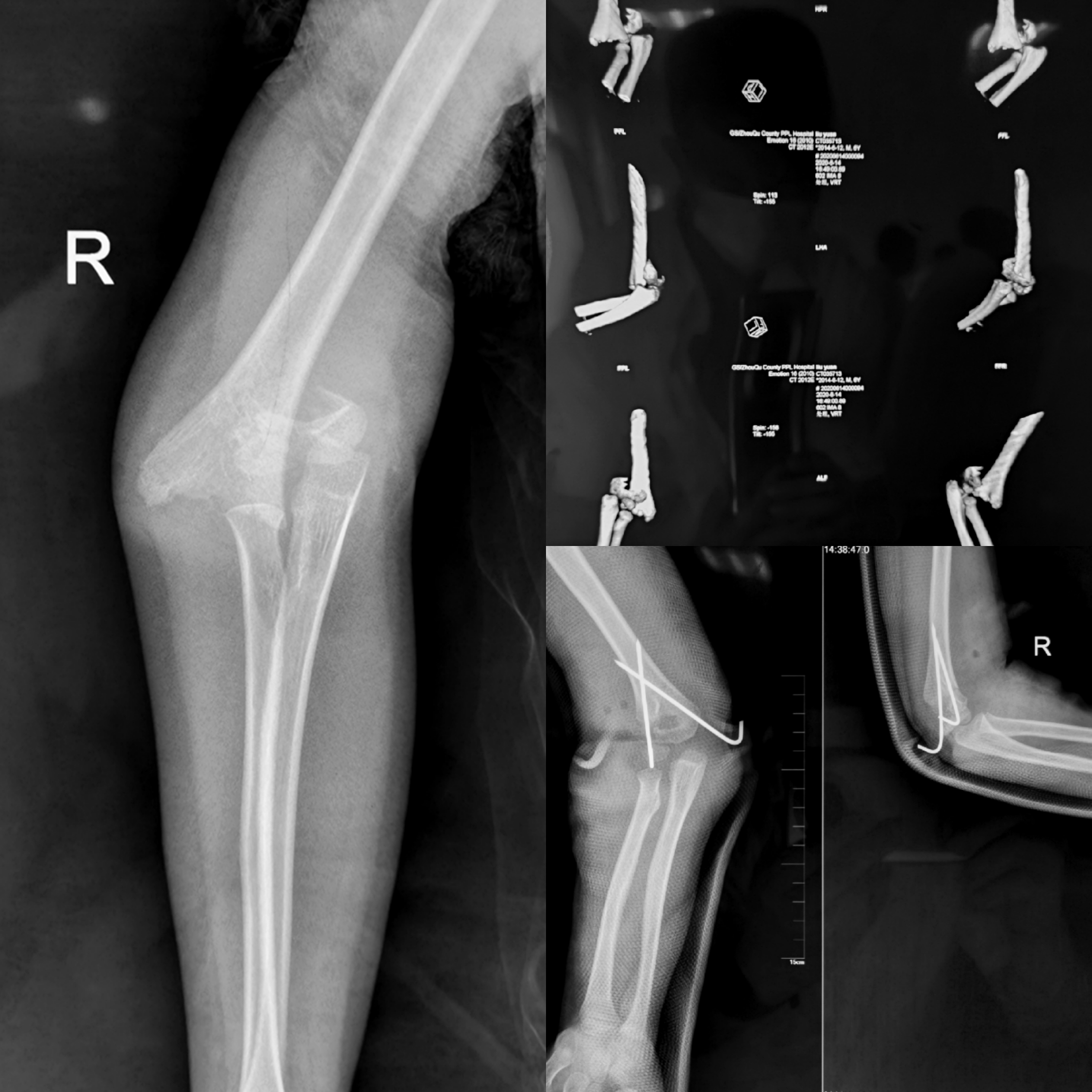 患儿,男性,6岁。以“玩耍时摔倒致右肘关节肿痛伴活动受限1天”入院。入院诊断显示右肱骨髁上骨折(Gartland Ⅲ型)。入院查体发现患儿右肘关节呈“靴状畸形”,肘关节周围肿胀明显,可见明显的皮下淤青,压痛(+),右肘关节屈伸活动均明显受限,右手腕关节及手部各关节活动良好,末梢血运及感觉无异常。患肢X线片提示右肱骨髁上骨折(Gartland Ⅲ型)。经严格的病情评估和术前讨论后,6月17日,在陈永刚医师的指导下,舟曲县人民医院骨科团队顺利完成“右肱骨髁上骨折经肘内侧切口切开复位内固定术”。术中一切顺利,术后患儿恢复良好。