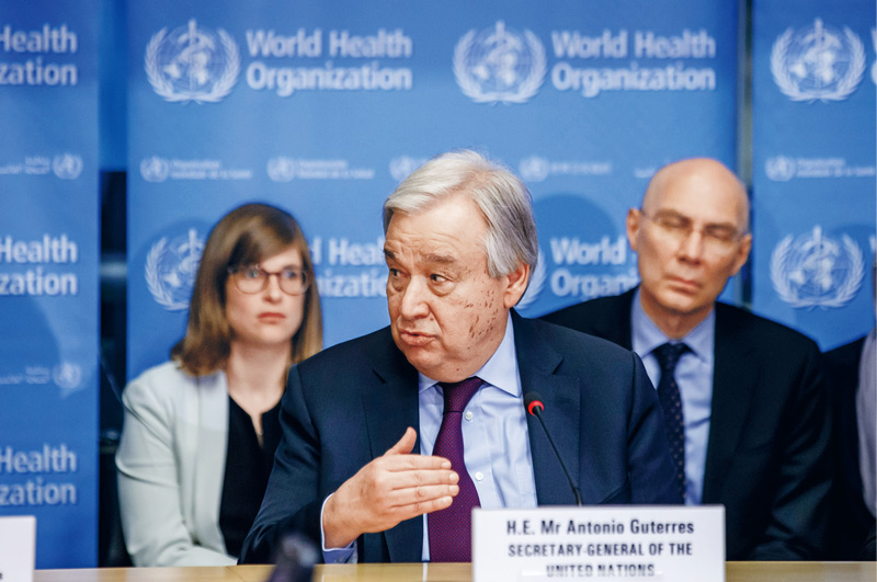 2020年2月24日,联合国秘书长古特雷斯(前)在瑞士日内瓦世界卫生组织总部发表讲话。古特雷斯表示,中国实施严格的防控措施,以牺牲正常生活的方式为全人类作出了贡献。古特雷斯当日造访日内瓦世卫组织总部,并与世卫组织各部门负责人举行座谈。