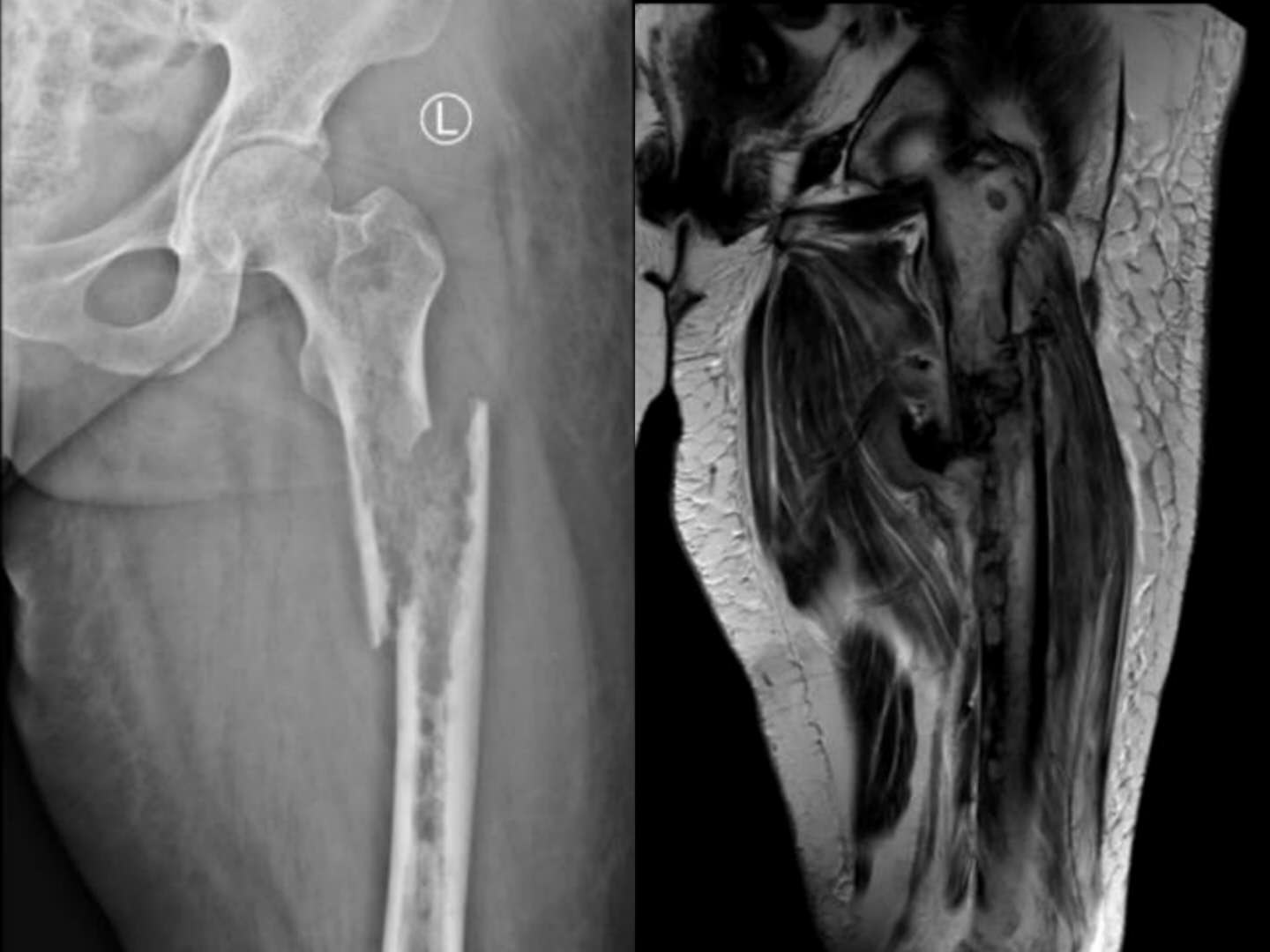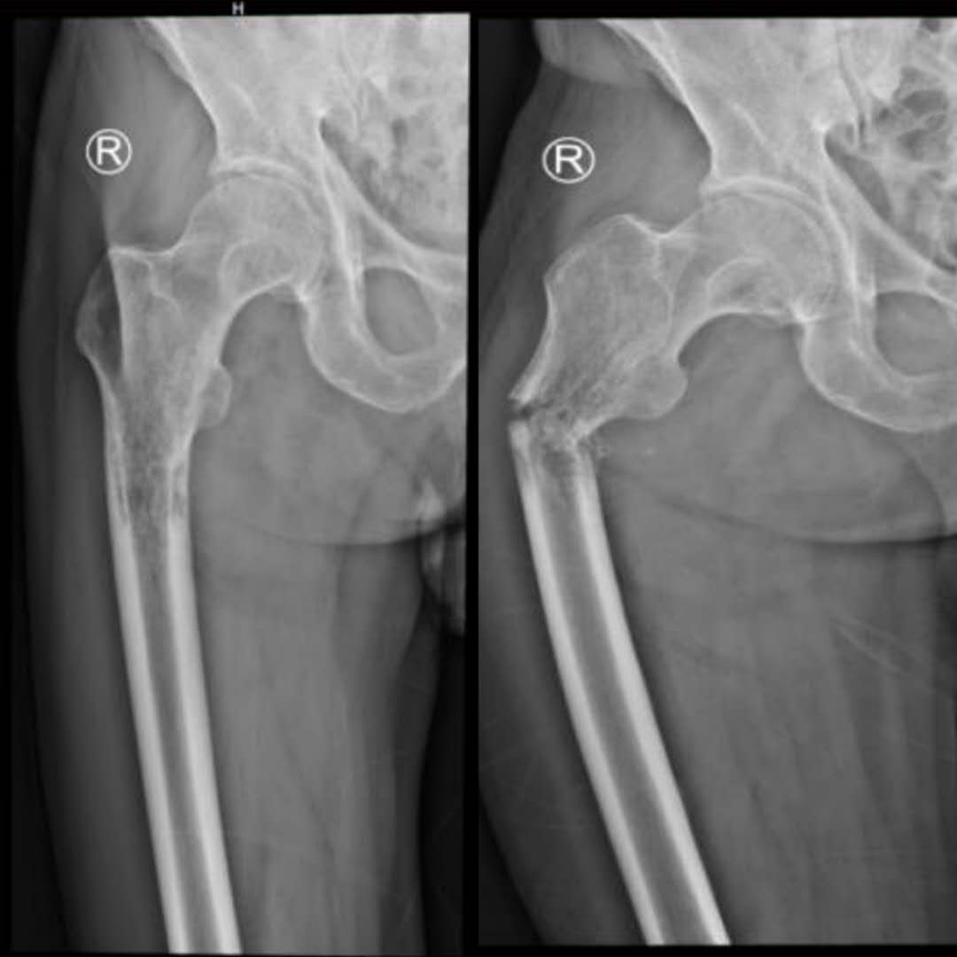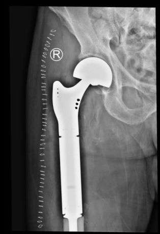 第二例患者男性,76岁,因“右大腿剧烈疼痛伴烦躁失眠,活动明显受限40余天”入院。查体见:痛苦病容,右大腿上端略肿胀,局部皮温略高,可触及包块,扣压痛明显,有骨擦音及异常活动,叩击足底时右大腿根部剧烈疼痛,余无明显异常。初步诊断为右股骨恶性肿瘤并病理性骨折。入院检查右股骨X线提示:右侧股骨近端虫蚀样骨质破,局部软组织密度改变。胸部CT平扫:1.双肺间质性改变,左肺上叶空洞型病变,邻近多发小结节及条索影,结核多考虑,请结合临床。 2.甲状腺多发钙化灶及小结节。 3.SPECT全身骨显像:右侧股骨近端代谢增高与减低并存,骨肿瘤与骨结核待进一别。穿刺活检病理提示为:(股骨)转移性腺癌。全身检查,未发现原发灶。该患者疼痛症状剧烈,伴烦躁不安,昼夜不眠,食欲不振,非常痛苦,服药效果不佳,曾要求截肢。其家属也强烈要求手术,全身严格评估后,术前多学科讨论认为符合手术适应症,遂顺利行瘤段切除,人工假体置换重建术,历时3小时半。术后患者以上不良症状均明显缓解,患者感激涕零,活动明显增加,三天后扶拐下地,医患双方对疗效非常满意,准备两至三周后行化疗及支持治疗。