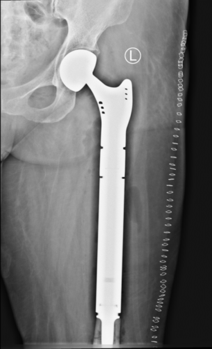 第一例患者女性,48岁,因“左大腿疼痛2月余,疼痛突然加重伴肿胀、畸形、活动障碍5天”入院。查体见痛苦病容,左大腿上端明显肿胀,呈屈曲、外旋、短缩畸形,左大腿中上段压痛明显,皮温升高,可触及骨擦感,左下肢活动障碍。初步诊断为左股骨病理性骨折。左股骨X线提示:左侧股骨近端虫蚀样骨质破坏并骨折,局部软组织密度改变。CT提示:左侧股骨上端广泛虫蚀状骨质破坏,中上段为著,周围软组织肿胀,考虑左侧股骨恶性骨肿瘤并病理性骨折。全身骨显像:左侧股骨中上段代谢异常增高伴软组织肿块,结合MRI考虑恶性骨肿瘤继发病理性骨折。后行穿刺活检,病理提示:符合转移性肺腺癌;(左侧远端髓腔肿物)见腺癌组织。由于患者非常痛苦,后并发下肢静脉血栓,其家属强烈要求手术,经我院医护对其全身严格评估并妥善处理下肢静脉血栓后,术前多学科讨论认为符合手术适应症,遂顺利行瘤段切除,人工假体置换重建术,髋关节囊及股骨上端重要肌肉附着点均使用laser韧带重建,历时3小时余。术后患者剧痛、烦躁、失眠等症状消失,活动明显增加,护理方便,医患双方对疗效非常满意,为后续治疗创造了有利条件。
