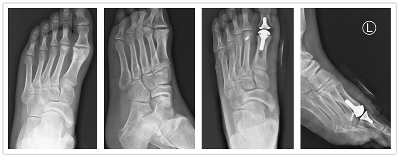 患者,男性,43岁。自诉行走时前足疼痛2年余,就诊于多家医院均无法明确诊治,经我院骨科四病区医护团队的仔细查体及影像学分析,明确诊断为踇僵硬。完善相关检查后,骨科四病区进行了全体讨论,并结合最新的足踝外科领域进展,决定为其实施人工生物金属聚乙烯假体全关节跖趾关节置换术。术中一切顺利,术后恢复良好,效果满意。