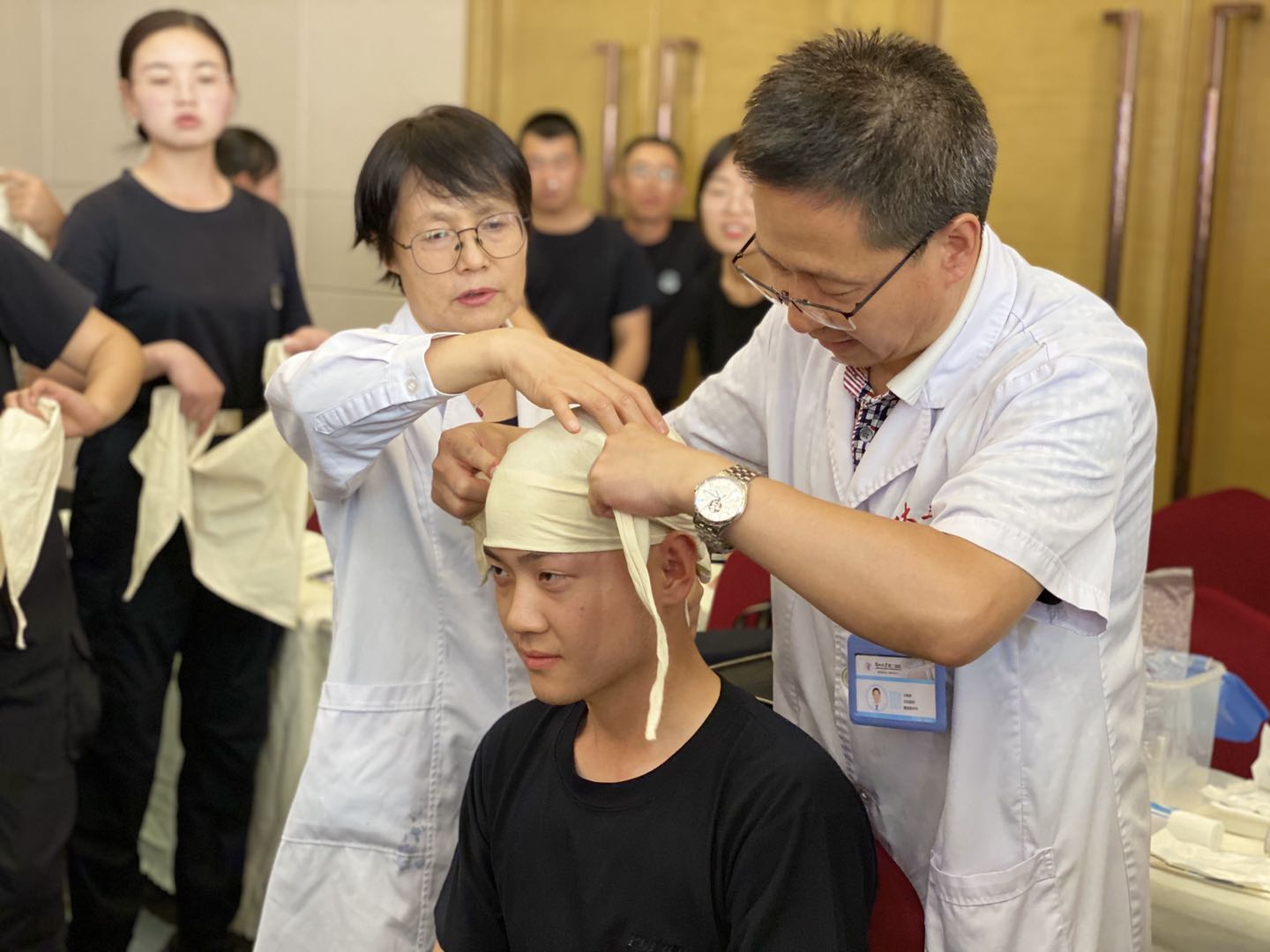 本次培训采用理论授课与实践相结合的教学模式,并利用模型人等教具对学员进行了手把手的培训及互动演练。培训中,王映珍向学员们全面系统的介绍了心肺复苏、上呼吸道异物梗阻的急救、触电、溺水及中暑等紧急情况的基本急救知识;张蓓就创伤现场救护(止血、包扎、固定、搬运)的基本理论知识进行了讲授。理论培训结束后,张蓓和姜拓之进行了现场心肺复苏、上呼吸道异物梗阻急救的操作演练,王映珍、南锐伶及薛玉琴进行了止血、包扎、固定的操作示范。随后,培训老师们分组对学员进行手把手的操作培训。