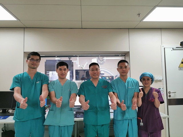 直播中,我院转播的第一台手术为1例74岁男性房颤患者,其栓塞评分7分,出血评分3分,手术方案为射频消融加左心耳封堵一站式手术,手术的前半部分为射频消融,由心血管内科吴强教授完成,后半部分左心耳封堵由胡浩副教授(术者)、孙守刚科主任(助手)、赵锋主任(食道超声专家)共同协作顺利完成。