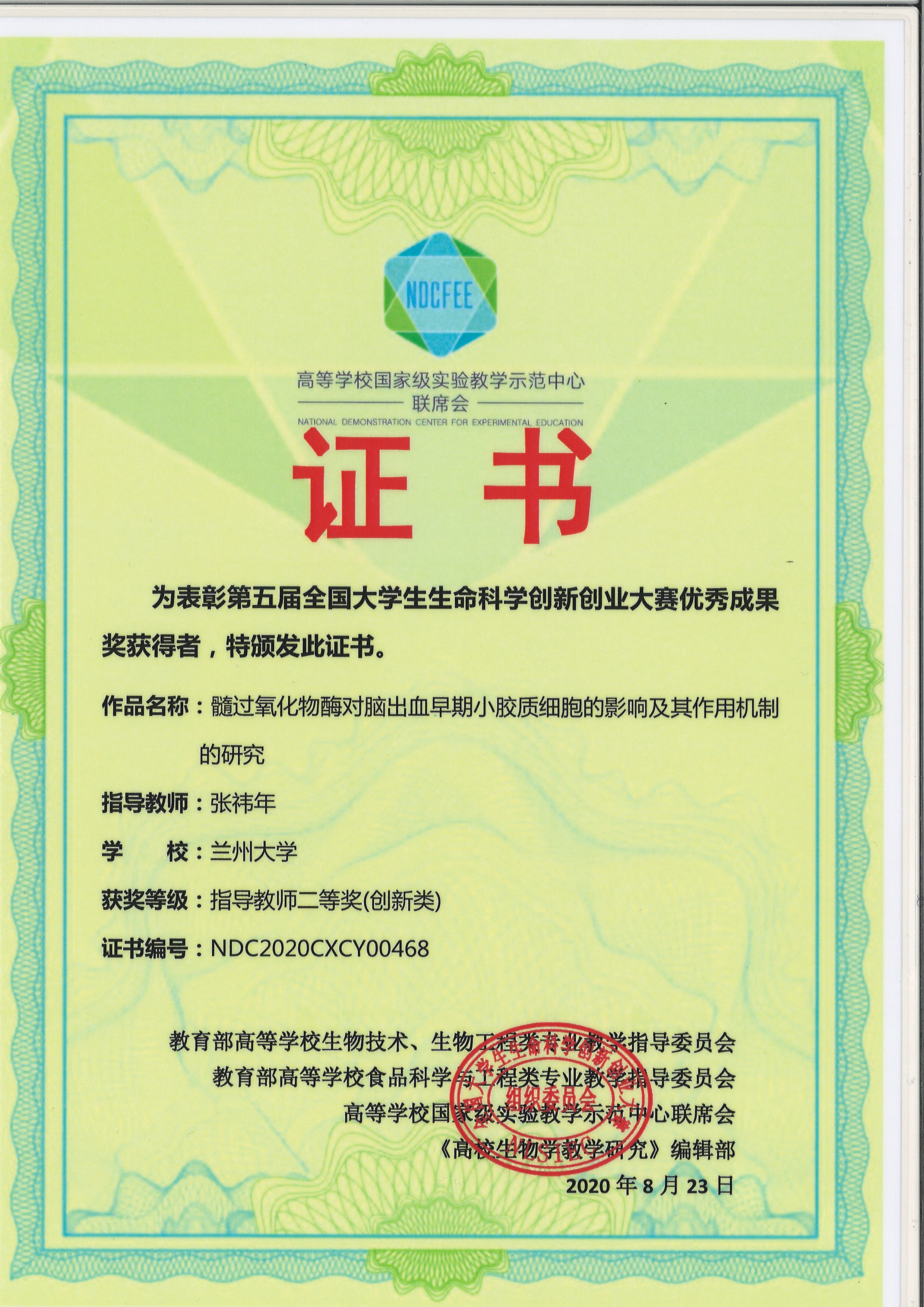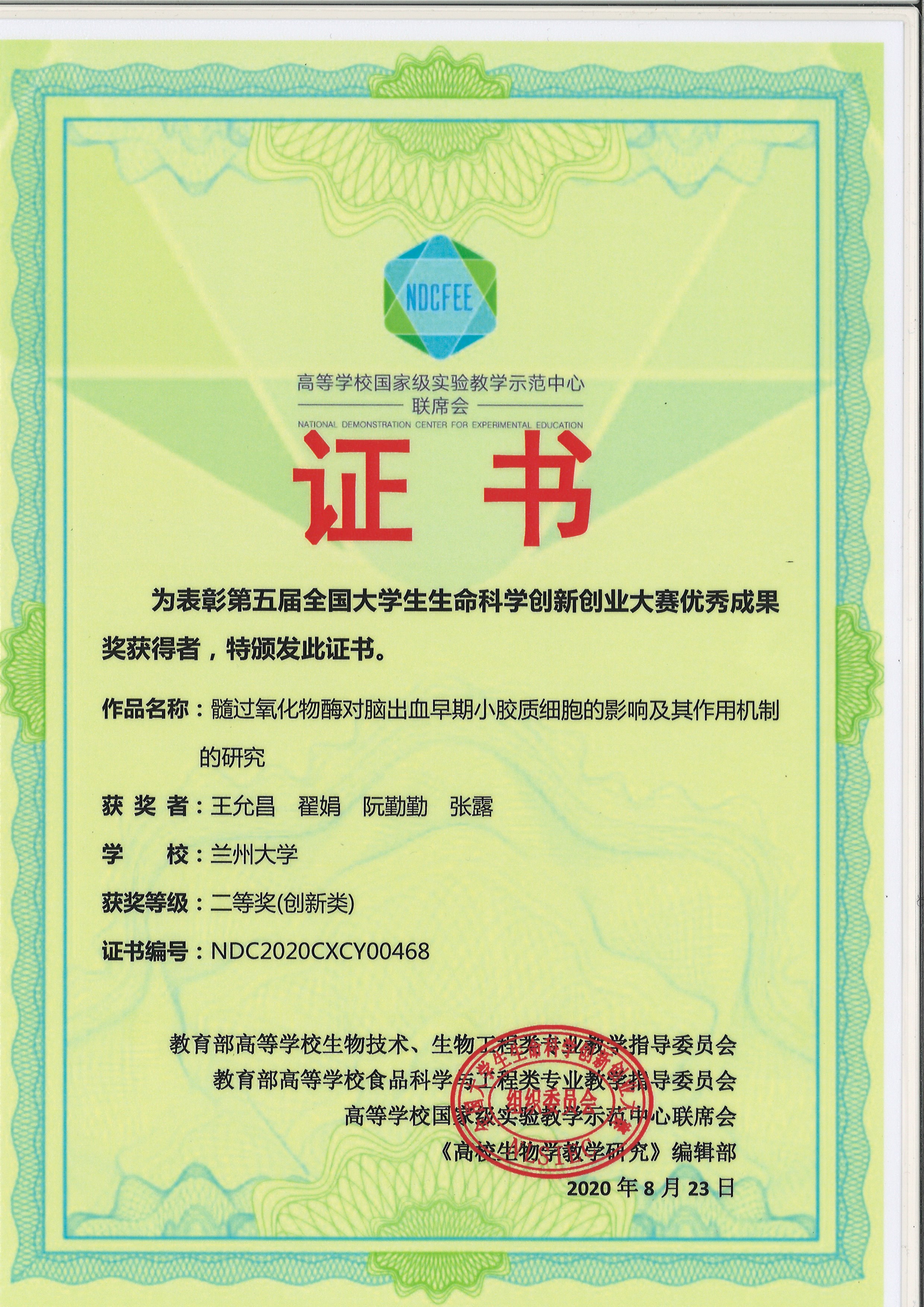 近日,在第五届全国大学生生命科学创新创业大赛中,第二临床医学院2016级临床医学专业本科生王允昌同学荣获创新组全国二等奖,为该项目的独立第一完成人,获奖项目名称为“髓过氧化物酶对脑出血早期小胶质细胞的影响及其作用机制的研究”,项目指导老师为我院神经外科一病区张祎年老师。在项目实施期间,张祎年老师全程给予重要指导,对项目中所遇到的技术壁垒和非预期结果,及时和项目负责人进行讨论分析。其余合作者为立博欧赔指数外国语学院翟娟、立博欧赔指数艺术学院阮勤勤和第二临床医学院张露,合作者主要负责了该项目中英文资料的编撰与修改、插图的设计与绘制和部分实验的操作与实施。该项目实施期间,立项了䇹政基金、国创、校创、萃英学子等6项基金,还获得了第十二届甘肃省挑战杯省一等奖,立博欧赔指数挑战杯校二等奖,发表相关论文7篇,相关专利2项,目前还有3篇论文在投。