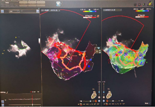 患者,男性,72岁主因“间断心悸4年余”收住入院。入院后完善相关检查,心电图提示心房颤动,既往曾植入起搏器治疗。术中采用UPS流程(Ultrasound ( ICE )指导下的左心房建模 +Pentaray 补充建模 + ST导管射频消融)。该方法优势在于真正做到了“零射线”的绿色电生理,避免了射线对患者及医务人员的危害,同时能做到精准消融,避免了心房的过度消融,还可做到高效消融,显著提高手术成功率,减少复发风险。手术持续时间仅为2小时,术后患者心电图提示窦性心律,患者心悸症状消失,好转出院。
