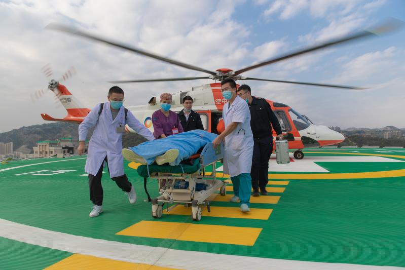 自2018年底,我院已选派了20名医护人员进行了航空救援培训,均取得航空救援资质。2020年9月29日,我院举行了直升机停机坪落成及医疗救援直升机试飞仪式活动,仅仅一个星期后,我院直升机停机坪就迎来了首次实际使用。