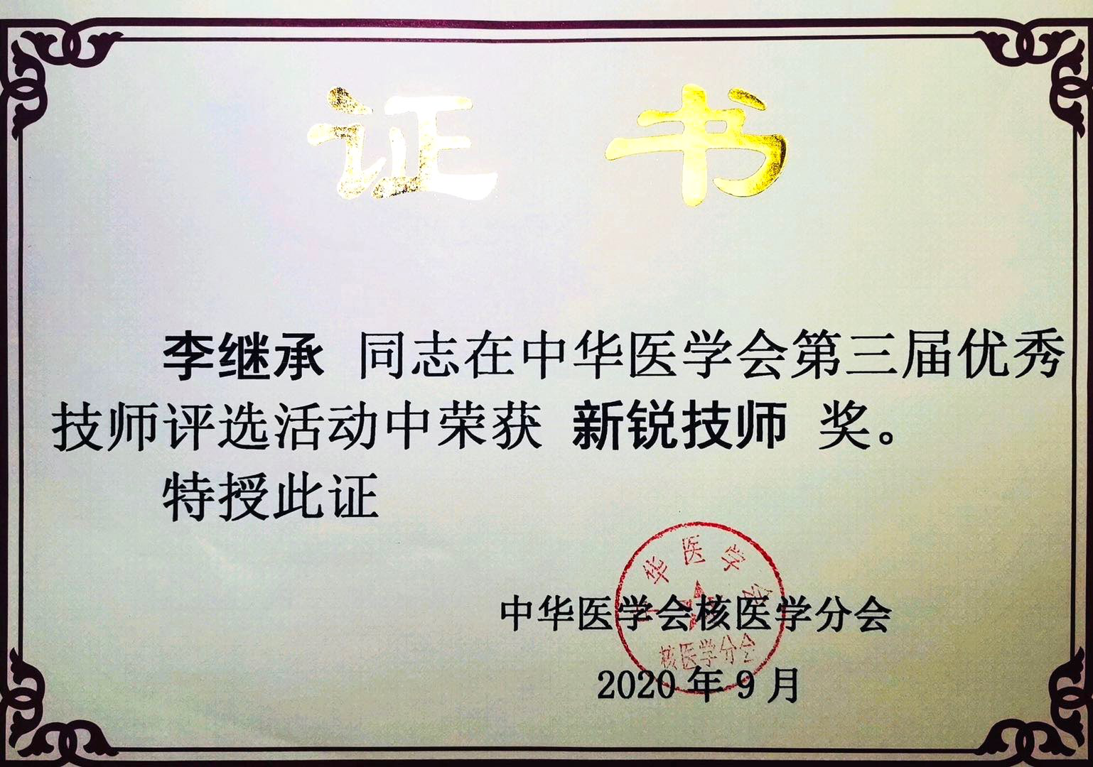 【喜讯】兰大二院核医学科李继承荣获中华医学会第三届全国核医学分会“新锐技师奖”荣誉称号
