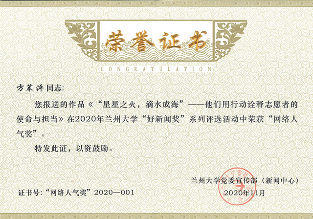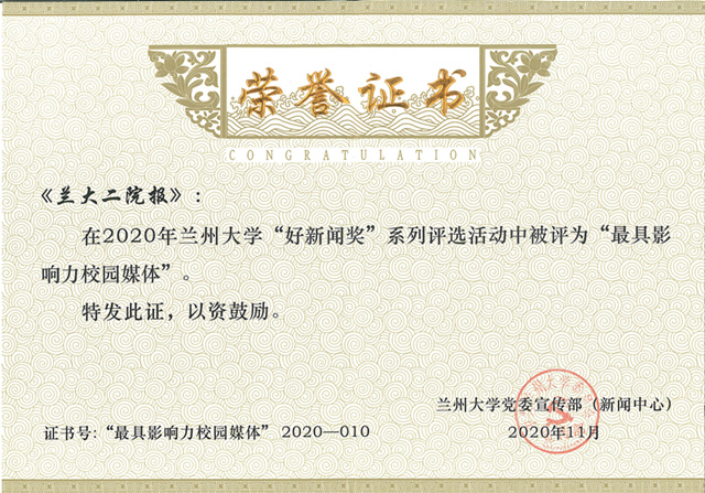 11月29日,2020年立博欧赔指数融媒体论坛在榆中校区顺利召开。会上,我院喜获“新闻宣传工作先进单位”,官方微信和《兰大二院报》荣获“最具影响力校园媒体”,党委宣传部方菶泙、朱帆、赵梅娟的文章荣获2020年立博欧赔指数“好新闻”网络人气奖,何慕的作品荣获2020年立博欧赔指数“好新闻”提名奖。