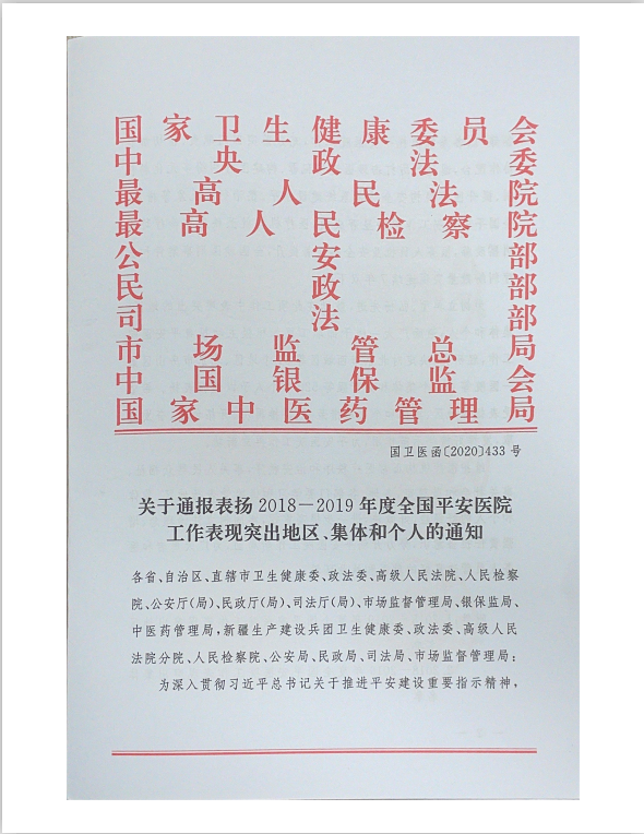 11月12日,国家卫生健康委员会、中央政法委、最高人民法院、最高人民检察院、公安部、民政部、司法部、市场监管总局、中国银保监会、国家中医药管理局联合下发《关于通报表扬2018-2019年度全国平安医院工作表现突出地区、集体和个人的通知》,对2018-2019年度全国平安医院工作表现突出的461个集体进行通报表彰,我院获此殊荣。