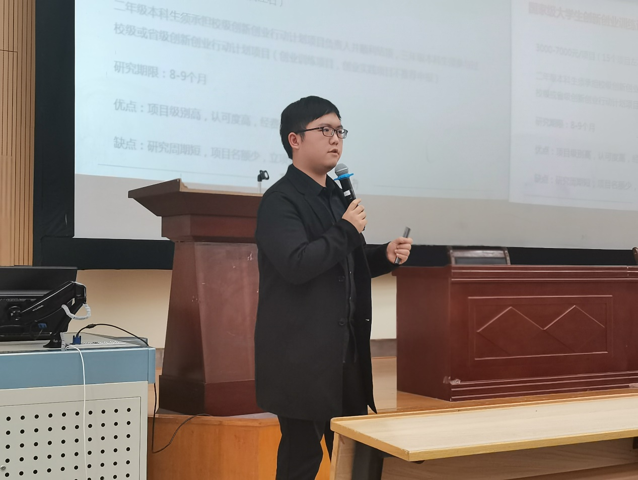 其后,四位宣讲团成员依次进行讲述,介绍了各种本科生创新创业类型的优缺点、科研周期,科研经费,并且结合自身的科研经历,将创新创业计划的申报方法、项目执行以及如何结项都做了说明。科研有助于科研思维的培养以及科研方法的探索,但是需要具备积极的工作态度、较强的学习能力和思考能力。